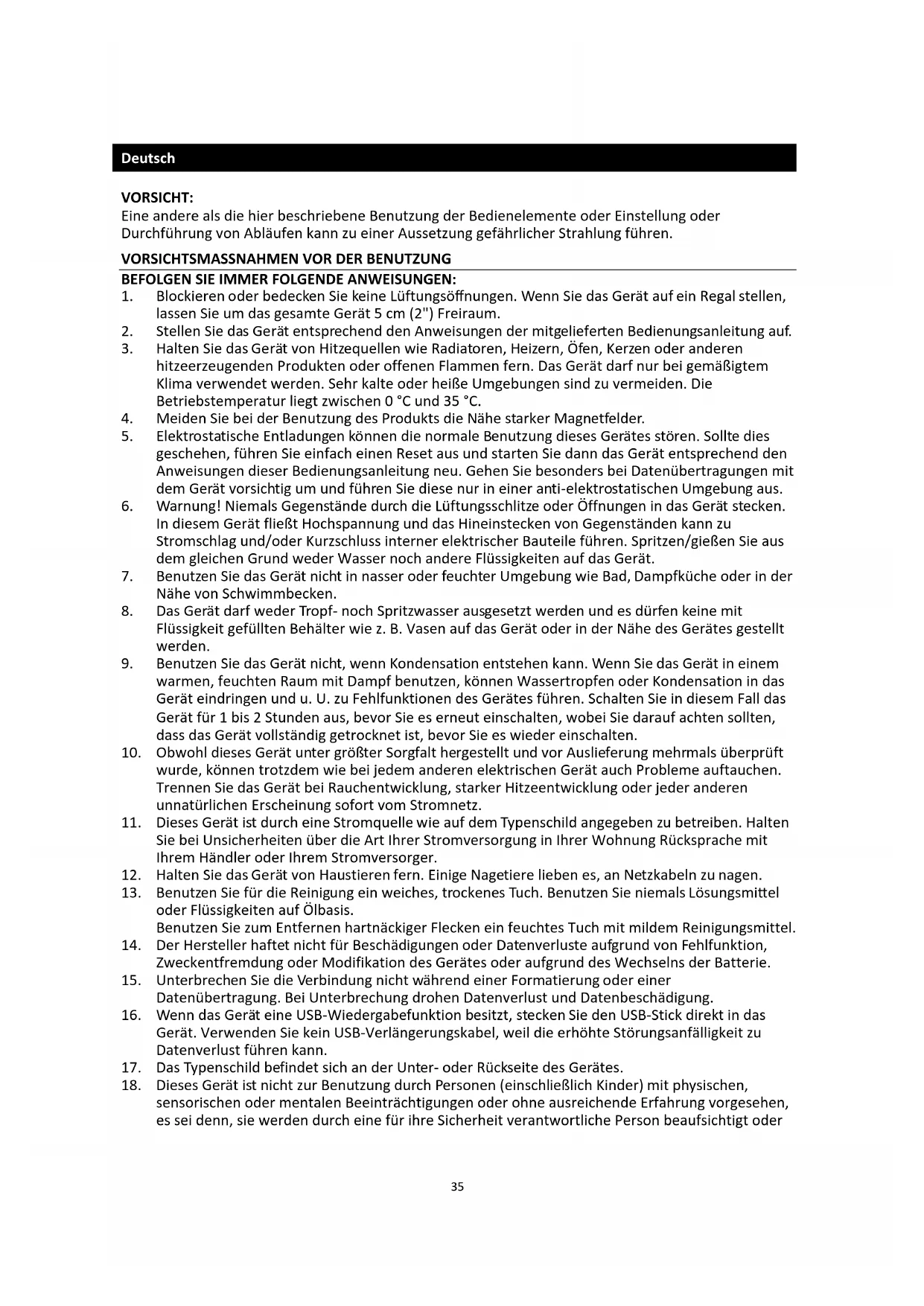 18. Dieses Gerät ist nicht zur Benutzung durch Personen (einschließlich Kinder) mit physischen,