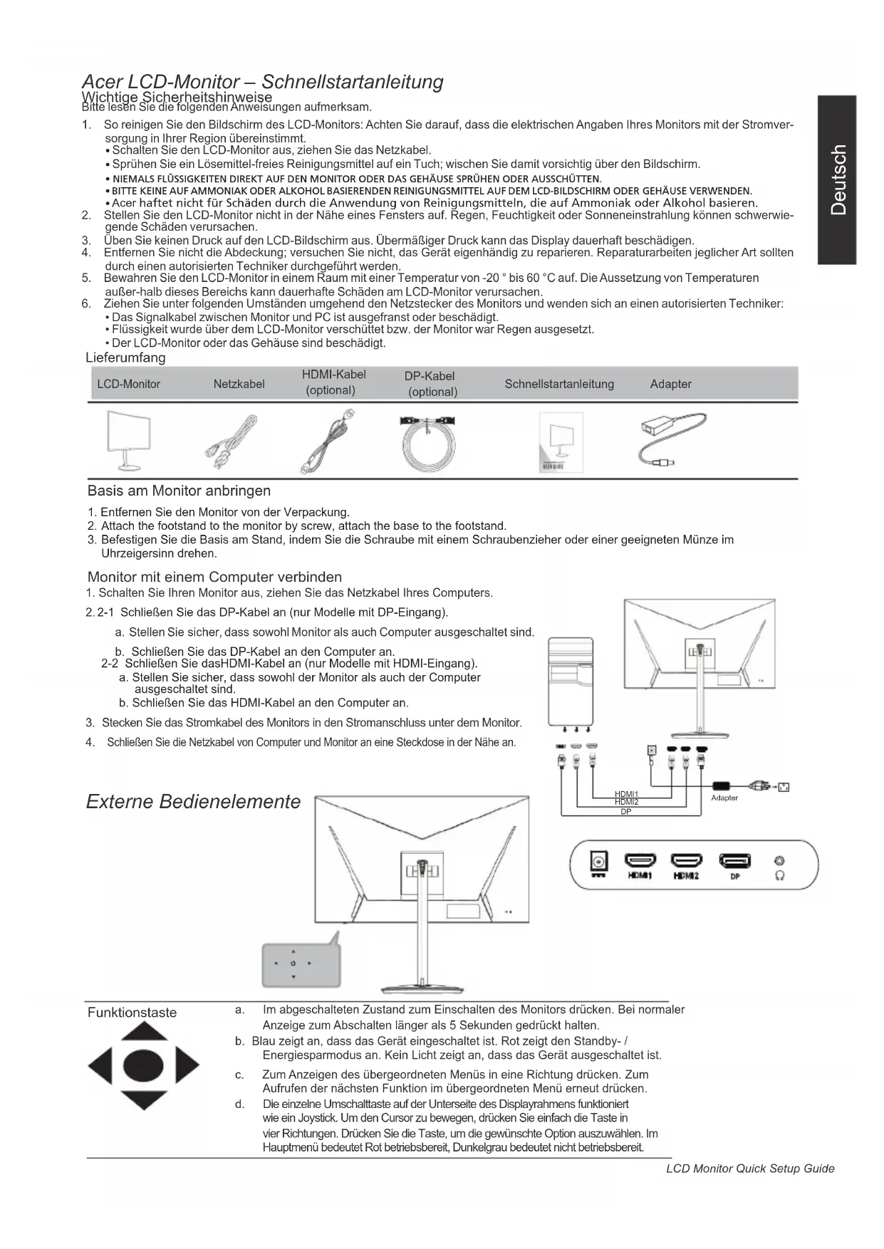 Lieferumfang ([WHUQH%HGLHQHOHPHQWH Acer/&'0RQLWRU±6FKQHOOVWDUWDQOHLWXQJ Wichtige Sicherheitshinweise Bitte lesen Sie die folgenden Anweisungen aufmerksam. 1. So reinigen Sie den Bildschirm des LCD-Monitors: Achten Sie darauf, dass die elektrischen Angaben Ihres Monitors mit der Stromver- sorgung in Ihrer Region übereinstimmt.