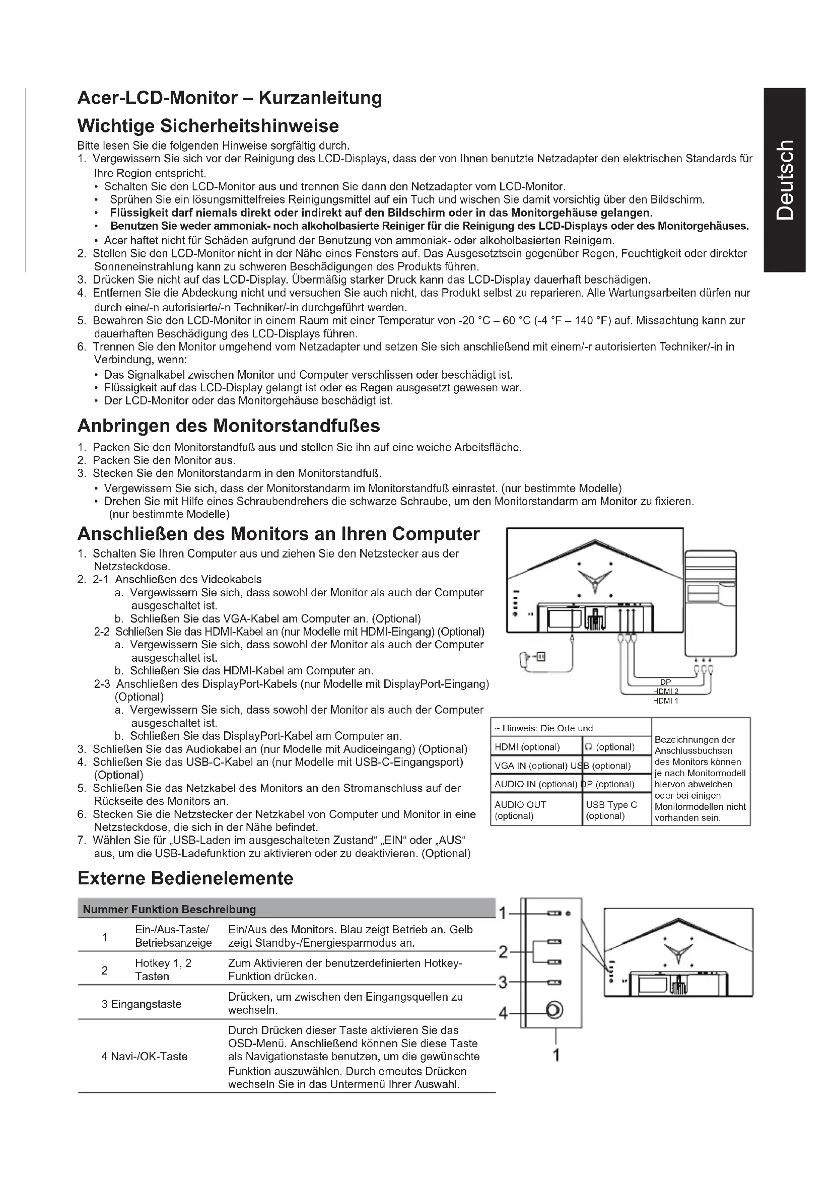 (typisch) Kontrast 100000000:1 Max. (ACM) Blickwinkel 178° (H), 178° (V) (CR = 10) Reaktionszeit 2 ms (Grau-zu-Grau); 0,5 ms (Grau-zu-Grau, min.) Bildschirmtyp k. A. Horiz. Frequenz HDMI: 31,469 – 192,692 KHz DisplayPort: 31,469 – 192,692 KHz Vert. Frequenz HDMI: 48 – 165 Hz DisplayPort: 48 – 165 Hz Displayfarben 16,7 Mio. Farben Pixeltakt HDMI: 393,092 MHz DisplayPort: 393,092 MHz Maximale Auflösung HDMI: 1920 x 1080 @ 165 Hz DisplayPort: 1920 x 1080 @ 165 Hz Plug & Play VESA DDCCI/DDC2B Leistungsaufnahme Im Modus Eingeschaltet 25 W (typisch) Ruhemodus 0,5 W (typisch) Ausgeschaltet 0,3 W (typisch) Eingangsbuchse HDMI (nur für Modelle mit HDMI-Eingang) (optional) DP (nur Modelle mit DP-Eingang) (optional) Videoeingangssignal DP (nur Modelle mit DP-Eingang) (optional) HDMI (nur für Modelle mit HDMI-Eingang) (optional) Lautsprecher 2 x 2 W (nur Modelle mit Audioeingang) (optional) Maximale Bildschirmgröße Horizontal: 598 mm Vertikal: 336 mm Stromquelle EINGANG: 100 – 240 V ~ 50/60 Hz Umgebungsbedingungen Betriebstemperatur: 0 °C bis 40 °C Lagertemperatur: -20 °C bis 60 °C Betriebsluftfeuchtigkeit: 20 % bis 80 % Abmessungen 614,7 (B) x 456,1 (H) x 240,7 (T) mm Nettogewicht 3,80 kg (netto) Mechanische Spezifikationen Neigbar: -5° bis +15° Schwenkbar: Nein Höhenverstellbar: Nein Drehbar: Nein Abnehmbarer Standfuß: Ja Externe Bedienelemente Schalter/Tasten Ein/Aus-Taste Schnellwahltaste 1 Schnellwahltaste 2 Eingang Menü/Navi/OK Funktionen Helligkeit Kontrast Blaulichtfilter Schwarzverst. ACM HDR Superscharf Gamma Farbtemp. Modi Farbraum Grauskala-Modus 6-Achs.-Farbton 6-Achs.-Sättig. Lautstärke Stumm Over Drive FreeSync Premium VRB Akt.-Freq.-Nr. Extrem geringe Latenz Zielpunkt Sprache OSD-Dauer Transparenz OSD-Sperre Eingang Auto-Quelle Bildformate Schnelltastenzuweisung DDC/CI HDMI-Schwarzp. Schnellstartmod. Info Alle Einst. rücksetzen Die genaue technische Ausstattung ist je nach Modell und/oder Region unterschiedlich. Anleitungen und weitere Dokumente für Ihr Acer-Produkt finden Sie auf der offiziellen Acer-Support-Webseite.Español Guía de inicio rápido del monitor LCD de Acer Instrucciones de seguridad importantes Lea detenidamente las siguientes instrucciones. 1. Limpiar la pantalla LCD: primero, compruebe que el adaptador eléctrico que utiliza se corresponda con el estándar eléctrico de su región.