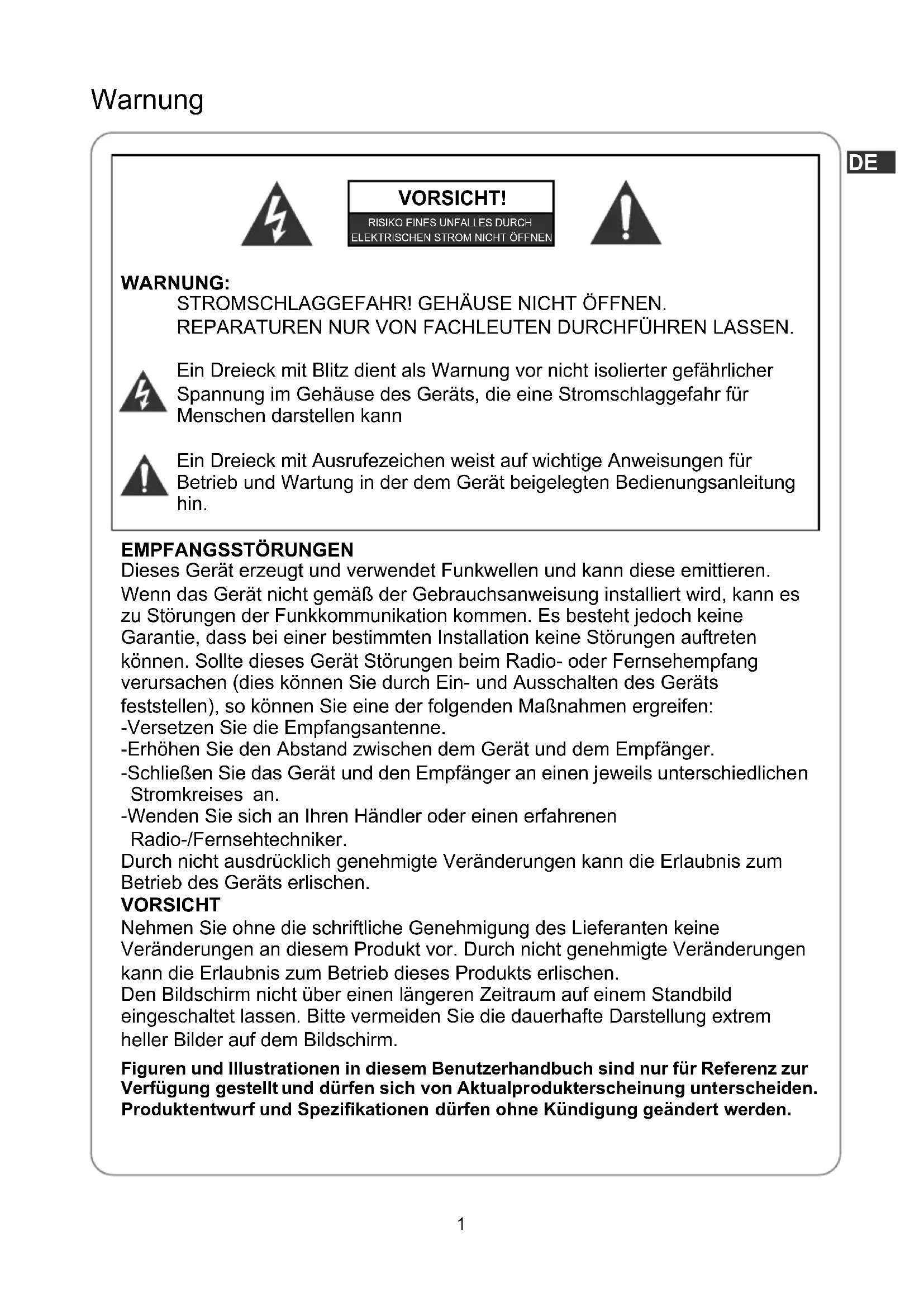 WARNUNG: STROMSCHLAGGEFAHR! GEHÄUSE NICHT ÖFFNEN. REPARATUREN NUR VON FACHLEUTEN DURCHFÜHREN LASSEN. Ein Dreieck mit Blitz dient als Warnung vor nicht isolierter gefährlicher Spannung im Gehäuse des Geräts, die eine Stromschlaggefahr für Menschen darstellen kann Ein Dreieck mit Ausrufezeichen weist auf wichtige Anweisungen für Betrieb und Wartung in der dem Gerät beigelegten Bedienungsanleitung hin. EMPFANGSSTÖRUNGEN Dieses Gerät erzeugt und verwendet Funkwellen und kann diese emittieren. Wenn das Gerät nicht gemäß der Gebrauchsanweisung installiert wird, kann es zu Störungen der Funkkommunikation kommen. Es besteht jedoch keine Garantie, dass bei einer bestimmten Installation keine Störungen auftreten können. Sollte dieses Gerät Störungen beim Radio- oder Fernsehempfang verursachen (dies können Sie durch Ein- und Ausschalten des Geräts feststellen), so können Sie eine der folgenden Maßnahmen ergreifen: -Versetzen Sie die Empfangsantenne. -Erhöhen Sie den Abstand zwischen dem Gerät und dem Empfänger. -Schließen Sie das Gerät und den Empfänger an einen jeweils unterschiedlichen Stromkreises an. -Wenden Sie sich an Ihren Händler oder einen erfahrenen Radio-/Fernsehtechniker. Durch nicht ausdrücklich genehmigte Veränderungen kann die Erlaubnis zum Betrieb des Geräts erlischen. VORSICHT Nehmen Sie ohne die schriftliche Genehmigung des Lieferanten keine Veränderungen an diesem Produkt vor. Durch nicht genehmigte Veränderungen Den Bildschirm nicht über einen längeren Zeitraum auf einem Standbild eingeschaltet lassen. Bitte vermeiden Sie die dauerhafte Darstellung extrem heller Bilder auf dem Bildschirm. kann die Erlaubnis zum Betrieb dieses Produkts erlischen.VORSICHT! RISIKO EINES UNFALLES DURCH ELEKTRISCHEN STROM NICHT ÖFFNEN Figuren und Illustrationen in diesem Benutzerhandbuch sind nur für Referenz zur Verfügung gestellt und dürfen sich von Aktualprodukterscheinung unterscheiden. Produktentwurf und Spezifikationen dürfen ohne Kündigung geändert werden.