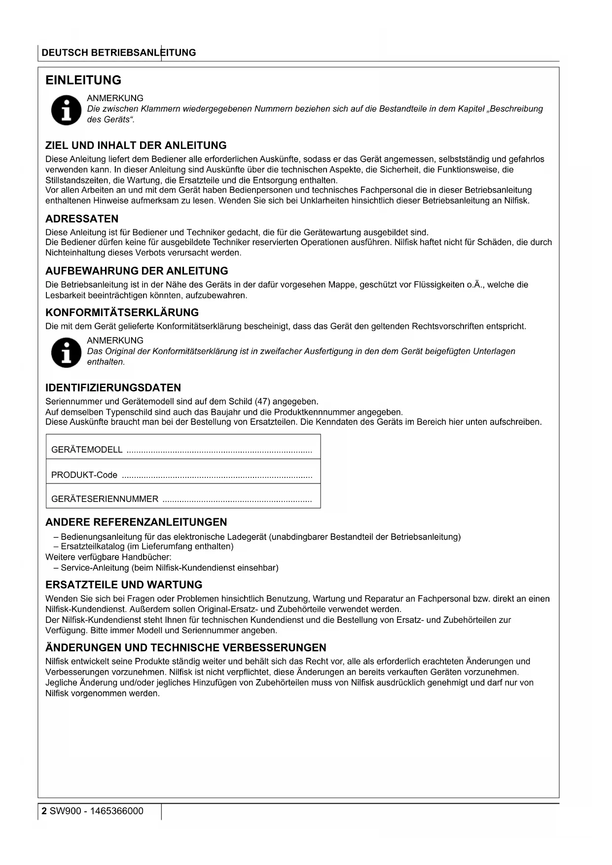 Die mit dem Gerät gelieferte Konformitätserklärung bescheinigt, dass das Gerät den geltenden Rechtsvorschriften entspricht. ANMERKUNG Das Original der Konformitätserklärung ist in zweifacher Ausfertigung in den dem Gerät beigefügten Unterlagen enthalten. IDENTIFIZIERUNGSDATEN Seriennummer und Gerätemodell sind auf dem Schild (47) angegeben. Auf demselben Typenschild sind auch das Baujahr und die Produktkennnummer angegeben. Diese Auskünfte braucht man bei der Bestellung von Ersatzteilen. Die Kenndaten des Geräts im Bereich hier unten aufschreiben. GERÄTEMODELL ............................................................................. PRODUKT-Code ............................................................................... GERÄTESERIENNUMMER .............................................................. ANDERE REFERENZANLEITUNGEN – Bedienungsanleitung für das elektronische Ladegerät (unabdingbarer Bestandteil der Betriebsanleitung) – Ersatzteilkatalog (im Lieferumfang enthalten) Weitere verfügbare Handbücher: – Service-Anleitung (beim Nilsk-Kundendienst einsehbar)