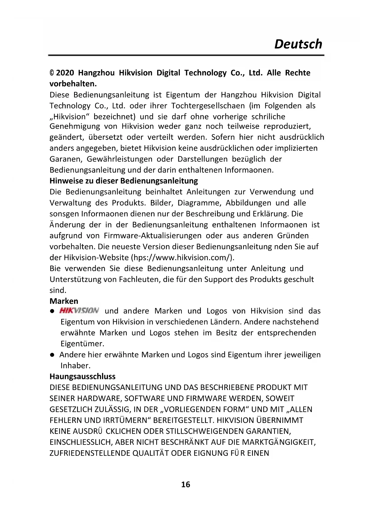 © 2020 Hangzhou Hikvision Digital Technology Co., Ltd. Alle Rechte vorbehalten. Diese Bedienungsanleitung ist Eigentum der Hangzhou Hikvision Digital Technology Co., Ltd. oder ihrer Tochtergesellschaften (im Folgenden als „Hikvision“ bezeichnet) und sie darf ohne vorherige schriftliche Genehmigung von Hikvision weder ganz noch teilweise reproduziert, geändert, übersetzt oder verteilt werden. Sofern hier nicht ausdrücklich anders angegeben, bietet Hikvision keine ausdrücklichen oder implizierten Garantien, Gewährleistungen oder Darstellungen bezüglich der Bedienungsanleitung und der darin enthaltenen Informationen. Hinweise zu dieser Bedienungsanleitung Die Bedienungsanleitung beinhaltet Anleitungen zur Verwendung und Verwaltung des Produkts. Bilder, Diagramme, Abbildungen und alle sonstigen Informationen dienen nur der Beschreibung und Erklärung. Die Änderung der in der Bedienungsanleitung enthaltenen Informationen ist aufgrund von Firmware-Aktualisierungen oder aus anderen Gründen vorbehalten. Die neueste Version dieser Bedienungsanleitung finden Sie auf der Hikvision-Website (https://www.hikvision.com/). Bitte verwenden Sie diese Bedienungsanleitung unter Anleitung und Unterstützung von Fachleuten, die für den Support des Produkts geschult sind. Marken und andere Marken und Logos von Hikvision sind das Eigentum von Hikvision in verschiedenen Ländern. Andere nachstehend erwähnte Marken und Logos stehen im Besitz der entsprechenden Eigentümer. Andere hier erwähnte Marken und Logos sind Eigentum ihrer jeweiligen Inhaber. Haftungsausschluss DIESE BEDIENUNGSANLEITUNG UND DAS BESCHRIEBENE PRODUKT MIT SEINER HARDWARE, SOFTWARE UND FIRMWARE WERDEN, SOWEIT GESETZLICH ZULÄSSIG, IN DER „VORLIEGENDEN FORM“ UND MIT „ALLEN FEHLERN UND IRRTÜMERN“ BEREITGESTELLT. HIKVISION ÜBERNIMMT KEINE AUSDRÜ CKLICHEN ODER STILLSCHWEIGENDEN GARANTIEN, EINSCHLIESSLICH, ABER NICHT BESCHRÄNKT AUF DIE MARKTGÄNGIGKEIT, ZUFRIEDENSTELLENDE QUALITÄT ODER EIGNUNG FÜR EINENDeutsch