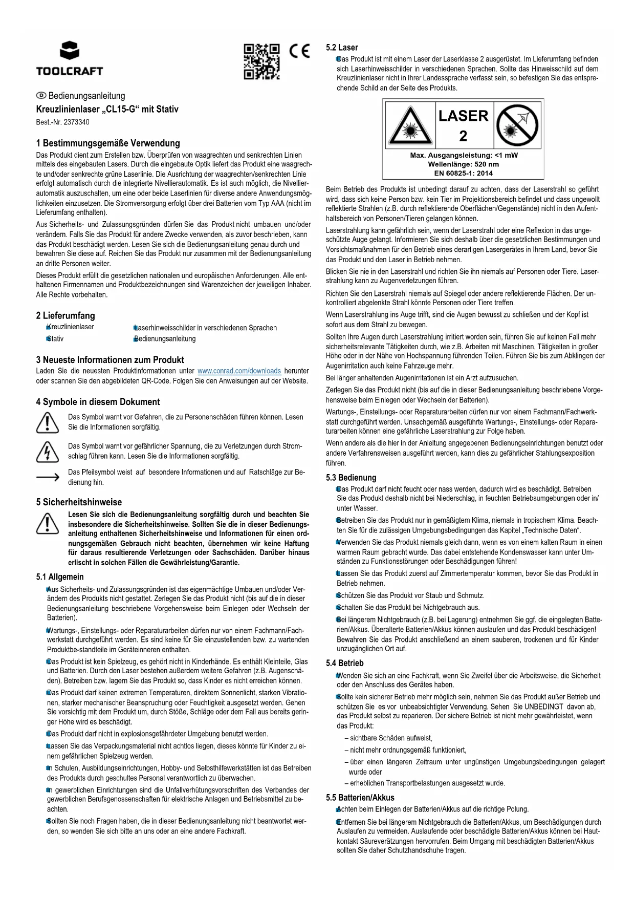 Bedienungsanleitung Kreuzlinienlaser „CL15-G“ mit Stativ Best.-Nr. 2373340 1 Bestimmungsgemäße Verwendung Das Produkt dient zum Erstellen bzw. Überprüfen von waagrechten und senkrechten Linien mittels des eingebauten Lasers. Durch die eingebaute Optik liefert das Produkt eine waagrech- te und/oder senkrechte grüne Laserlinie. Die Ausrichtung der waagrechten/senkrechten Linie erfolgt automatisch durch die integrierte Nivellierautomatik. Es ist auch möglich, die Nivellier- automatik auszuschalten, um eine oder beide Laserlinien für diverse andere Anwendungsmög- lichkeiten einzusetzen. Die Stromversorgung erfolgt über drei Batterien vom Typ AAA (nicht im Lieferumfang enthalten). Aus Sicherheits- und Zulassungsgründen dürfen Sie das Produkt nicht umbauen und/oder verändern. Falls Sie das Produkt für andere Zwecke verwenden, als zuvor beschrieben, kann das Produkt beschädigt werden. Lesen Sie sich die Bedienungsanleitung genau durch und bewahren Sie diese auf. Reichen Sie das Produkt nur zusammen mit der Bedienungsanleitung an dritte Personen weiter. Dieses Produkt erfüllt die gesetzlichen nationalen und europäischen Anforderungen. Alle ent- haltenen Firmennamen und Produktbezeichnungen sind Warenzeichen der jeweiligen Inhaber. Alle Rechte vorbehalten. 2 Lieferumfang Kreuzlinienlaser Stativ 3 Neueste Informationen zum Produkt Laden Sie die neuesten Produktinformationen unter www.conrad.com/downloads herunter oder scannen Sie den abgebildeten QR-Code. Folgen Sie den Anweisungen auf der Website. 4 Symbole in diesem Dokument Das Symbol warnt vor Gefahren, die zu Personenschäden führen können. Lesen Sie die Informationen sorgfältig. Das Symbol warnt vor gefährlicher Spannung, die zu Verletzungen durch Strom- schlag führen kann. Lesen Sie die Informationen sorgfältig. Das Pfeilsymbol weist auf besondere Informationen und auf Ratschläge zur Be- dienung hin. 5 Sicherheitshinweise Lesen Sie sich die Bedienungsanleitung sorgfältig durch und beachten Sie insbesondere die Sicherheitshinweise. Sollten Sie die in dieser Bedienungs- anleitung enthaltenen Sicherheitshinweise und Informationen für einen ord- nungsgemäßen Gebrauch nicht beachten, übernehmen wir keine Haftung für daraus resultierende Verletzungen oder Sachschäden. Darüber hinaus erlischt in solchen Fällen die Gewährleistung/Garantie.
