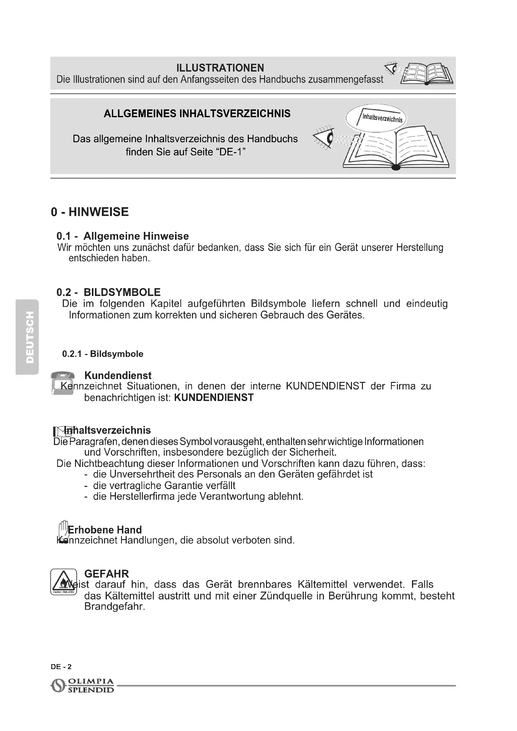 fältigung oder Übermittlung an Dritte ohne ausdrückliche Genehmigung der Firma OLIMPIA SPLENDID. An den Geräten können technische Neuerungen vorgenom- men werden, d.h. Einzelteile können u.U. anders aussehen als auf den Abbildungen, was jedoch die Gültigkeit der Anweisungen in diesem Benutzerhandbuch in keiner Weise beeinträchtigt. BEIM UMGANG MIT ELEKTROGERÄTEN MÜSSEN STETS GEWISSE GRUNDLEGENDE SICHERHEITSMASSNAHMEN BEACHTET WERDEN, UM DIE GEFAHR VON BRAND, STROMSCHLÄGEN UND VERLETZUNGEN