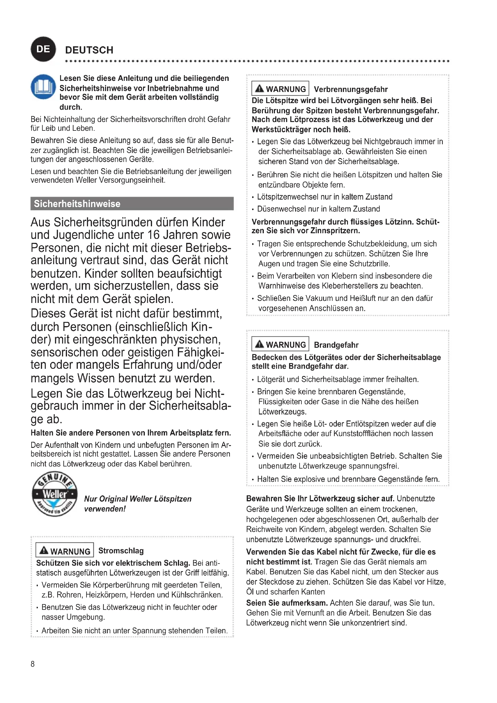 DEUTSCH Vermeiden Sie abnormale Körperhaltung. Gestalten Sie Ihren Arbeitsplatz ergonomisch richtig. Vermeiden Sie Haltungsfehler beim Arbeiten, Haltungsfehler verursachen Haltungsschäden. Das Lötwerkzeug darf nur in technisch einwandfreiem Zustand in Betrieb genommen werden. Schutzvorrichtun- gen dürfen nicht außer Betrieb gesetzt werden. Störungen und Defekte müssen umgehend beseitigt wer- den. Vor jedem Gebrauch des Geräts / Werkzeugs müssen Schutzvorrichtungen sorgfältig auf Ihre einwandfreie und be- stimmungsgemäße Funktion untersucht werden. Überprüfen Sie, ob die beweglichen Teile einwandfrei funktionieren und nicht klemmen oder ob Teile beschädigt sind. Sämtliche Teile müssen richtig montiert sein und alle Bedingungen erfüllen, um den einwandfreien Betrieb des Geräts zu gewährleisten. Benutzen Sie das richtige Werkzeug. Benutzen Sie nur Zubehör oder Zusatzgeräte, die in der Zubehörliste aufge- führt sind oder vom Hersteller freigegeben sind. Benutzen Sie WELLER Zubehör oder Zusatzgeräte nur an original WELLER Geräten. Der Gebrauch anderer Werkzeuge und anderen Zubehörs kann eine Verletzungsgefahr für Sie bedeuten. Sichern Sie das Werkzeug. Benutzen Sie Spannvorrichtun- gen um das Werkstück festzuhalten. Verwenden Sie eine Lötrauchabsaugung. Wenn Vorrichtungen zum Anschluss von Lötrauchabsaugungen vorhanden sind, überzeugen Sie sich, dass diese angeschlossen und richtig benutzt werden. Bestimmungsgemäße Verwendung Verwenden Sie den Lötkolben ausschließlich gemäß dem in der Betriebsanleitung angegebenen Zweck zum Löten und Entlöten unter den hier angegebenen Bedingungen. Der Lötkolben darf nur mit den Weller Versorgungseinheiten betrieben werden. Dieses Gerät darf nur bei Raumtemperatur und in Innen- räumen verwendet werden. Vor Feuchtigkeit und direkter Sonneneinstrahlung schützen. Benutzergruppen Aufgrund unterschiedlich hoher Risiken und Gefahrenpo- tentiale dürfen einige Arbeitsschritte nur von geschulten Fachkräften ausgeführt werden. Arbeitsschritt Benutzergruppen Vorgabe der Lötparameter Fachpersonal mit technischer Ausbildung Auswechseln von elektri- schen Ersatzteilen Elektrofachkraft Vorgabe von Wartungsin- tervallen Sicherheitsfachkraft Bedienen Filterwechsel Laien Arbeitsschritt Benutzergruppen Bedienen Filterwechsel Auswechseln von elektri- schen Ersatzteilen Technische Auszubildende unter Anleitung und Aufsicht einer ausgebildeten Fachkraft Pege und Wartung WARNUNG Vor allen Arbeiten am Gerät Stecker aus der Steck- dose ziehen. Gerät abkühlen lassen. Kontrollieren Sie regelmäßig alle angeschlossenen Kabel und Schläuche. Schadhafte Elektrowerkzeuge sofort jeder weiteren Verwendung entziehen. Verstopfte Düsen dürfen nicht verwendet werden. Reparaturen müssen durch von Weller ausgebildete Personen erfolgen. Nur original WELLER-Ersatzteile verwenden. WARNUNG Verbrennungsgefahr