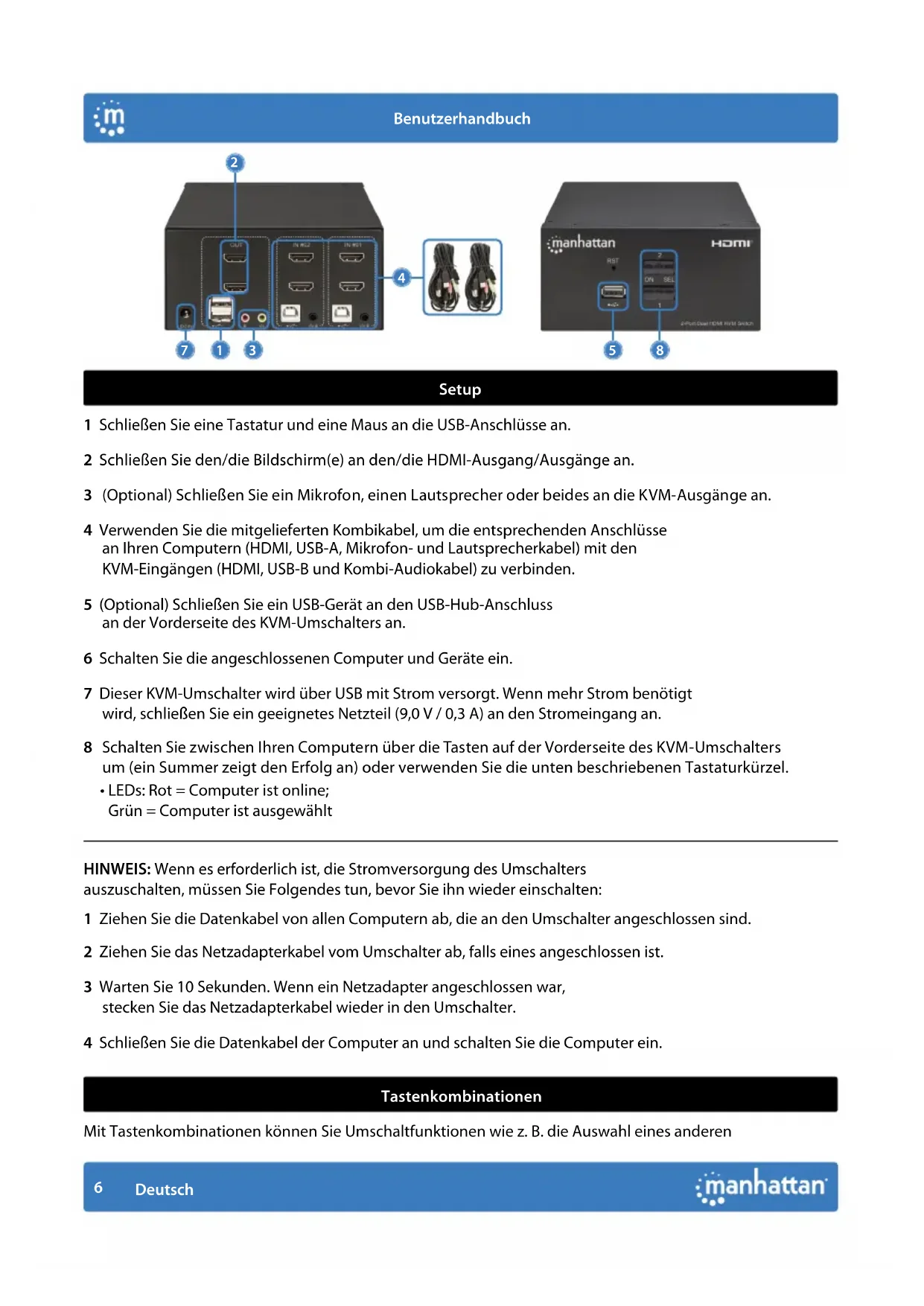 For specifications, go to manhattanproducts.com. Register your product at register.manhattanproducts.com/r/153522 or scan the QR code on the cover.6 Deutsch Benutzerhandbuch Setup 1 Schließen Sie eine Tastatur und eine Maus an die USB-Anschlüsse an. 2 Schließen Sie den/die Bildschirm(e) an den/die HDMI-Ausgang/Ausgänge an. 3 (Optional) Schließen Sie ein Mikrofon, einen Lautsprecher oder beides an die KVM-Ausgänge an. 4 Verwenden Sie die mitgelieferten Kombikabel, um die entsprechenden Anschlüsse an Ihren Computern (HDMI, USB-A, Mikrofon- und Lautsprecherkabel) mit den KVM-Eingängen (HDMI, USB-B und Kombi-Audiokabel) zu verbinden. 5 (Optional) Schließen Sie ein USB-Gerät an den USB-Hub-Anschluss an der Vorderseite des KVM-Umschalters an. 6 Schalten Sie die angeschlossenen Computer und Geräte ein. 7 Dieser KVM-Umschalter wird über USB mit Strom versorgt. Wenn mehr Strom benötigt wird, schließen Sie ein geeignetes Netzteil (9,0 V / 0,3 A) an den Stromeingang an. 8 Schalten Sie zwischen Ihren Computern über die Tasten auf der Vorderseite des KVM-Umschalters um (ein Summer zeigt den Erfolg an) oder verwenden Sie die unten beschriebenen Tastaturkürzel.