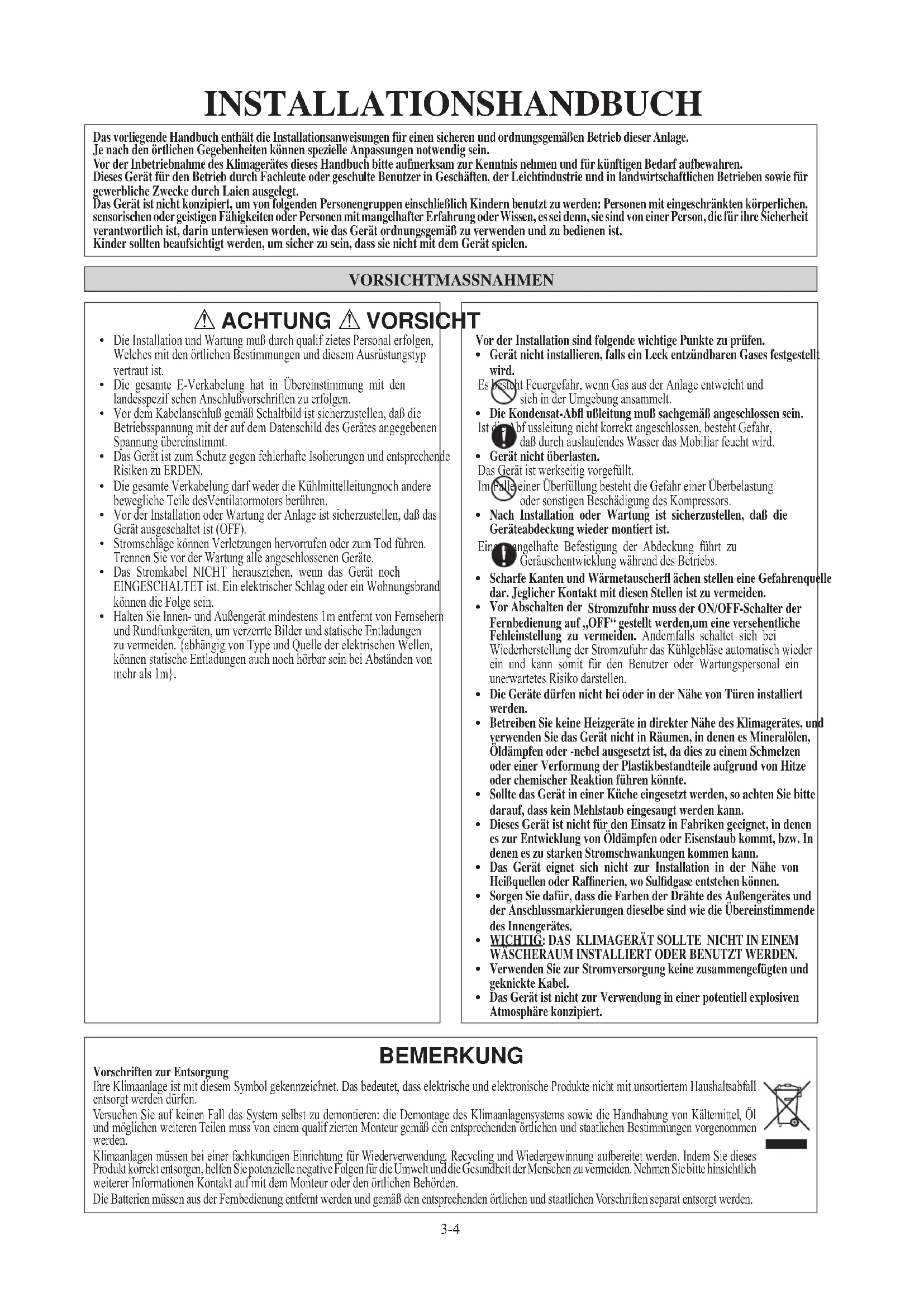 VORSICHTMASSNAHMEN INSTALLATIONSHANDBUCH BEMERKUNG Vorschriften zur Entsorgung Ihre Klimaanlage ist mit diesem Symbol gekennzeichnet. Das bedeutet, dass elektrische und elektronische Produkte nicht mit unsortiertem Haushaltsabfall entsorgt werden dürfen. Versuchen Sie auf keinen Fall das System selbst zu demontieren: die Demontage des Klimaanlagensystems sowie die Handhabung von Kältemittel, Öl und möglichen weiteren Teilen muss von einem qualif zierten Monteur gemäß den entsprechenden örtlichen und staatlichen Bestimmungen vorgenommen werden. Klimaanlagen müssen bei einer fachkundigen Einrichtung für Wiederverwendung, Recycling und Wiedergewinnung aufbereitet werden. Indem Sie dieses Produkt korrekt entsorgen, helfen Sie potenzielle negative Folgen für die Umwelt und die Gesundheit der Menschen zu vermeiden. Nehmen Sie bitte hinsichtlich weiterer Informationen Kontakt auf mit dem Monteur oder den örtlichen Behörden. Die Batterien müssen aus der Fernbedienung entfernt werden und gemäß den entsprechenden örtlichen und staatlichen Vorschriften separat entsorgt werden. Das vorliegende Handbuch enthält die Installationsanweisungen für einen sicheren und ordnungsgemäßen Betrieb dieser Anlage. Je nach den örtlichen Gegebenheiten können spezielle Anpassungen notwendig sein. Vor der Inbetriebnahme des Klimagerätes dieses Handbuch bitte aufmerksam zur Kenntnis nehmen und für künftigen Bedarf aufbewahren. Dieses Gerät für den Betrieb durch Fachleute oder geschulte Benutzer in Geschäften, der Leichtindustrie und in landwirtschaftlichen Betrieben sowie für gewerbliche Zwecke durch Laien ausgelegt. Das Gerät ist nicht konzipiert, um von folgenden Personengruppen einschließlich Kindern benutzt zu werden: Personen mit eingeschränkten körperlichen, sensorischen oder geistigen Fähigkeiten oder Personen mit mangelhafter Erfahrung oder Wissen, es sei denn, sie sind von einer Person, die für ihre Sicherheit verantwortlich ist, darin unterwiesen worden, wie das Gerät ordnungsgemäß zu verwenden und zu bedienen ist. Kinder sollten beaufsichtigt werden, um sicher zu sein, dass sie nicht mit dem Gerät spielen. 3 IM-5WMYJ-1113(2)DK SIESTA_DE.i4 4 1/8/15 2:04:11 PM3-5 Deutsch Wichtige Informationen hinsichtlich des verwendeten Kältemittels Dieses Produkt enthält fluorierte Treibhausgase. Lassen Sie Gase nicht in die Atmosphäre ab. Kältemitteltyp: R410A GWP (1) Wert: 2087,5 (1) GWP = Treibhauspotential Bitte füllen Sie das Etikett betr. Auffüllen des Kühlmittels, 1 die werkseitige Kältemittelbefüllung des Produktes, 2 die am Montageort befüllte zusätzliche Kältemittelmenge und 1 + 2 die gesamte Kältemittelbefüllung der Lieferung dieses Gerätes beigelegt, mit abriebfester Tinte wie folgt aus: Das ausgefüllte Etikett muss in der Nähe der Kältemittel-Einfüllöffnung angehängt werden (z.B. auf der Innenseite der Wartungsblende). werkseitige Kältemittelbefüllung des Produktes: siehe Typenschild der Einheit (2) zusätzliche am Montageort befüllte Kältemittelmenge gesamte Kältemittelbefüllung fluorierte Treibhausgase enthält, Außen-Gerät kältemittelzylinder und Sammelleitung für die Befüllung (2) Bei System mit mehreren Geräten muss nur ein Etikett angehängt werden*, dass die gesamte werkseitige Kältemittelbefüllung am Kältemittelsystem angeschlossener Gertäte angibt. Überprüfungen in Bezug auf Kältemittellecks müssen in regelmäßigen Abständen je nach den europäischen oder nationalen Bestimmungen durchgeführt werden. Kontaktieren Sie bitte Ihren örtlichen Händler bezüglich weiterer Informationen.