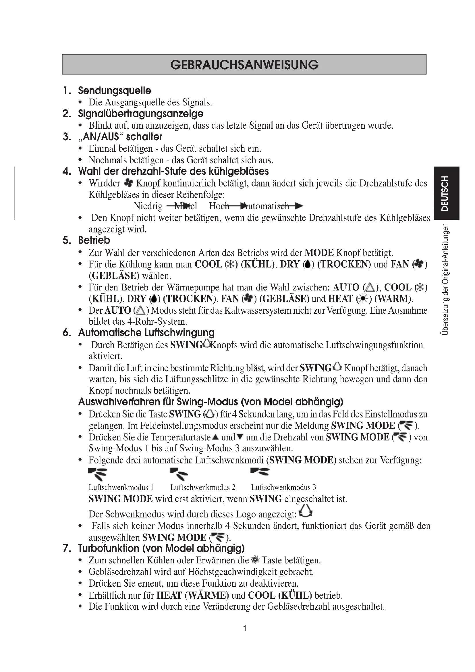 UH ANTIGEL (AUTRES PIÈCES) 2 OM-GS02-1111(3)Dk(siesta)FR.inSec1:4 Sec1:42 OM-GS02-1111(3)Dk(siesta)FR.inSec1:4 Sec1:4 4/8/14 12:24:59 PM4/8/14 12:24:59 PM1 GEBRAUCHSANWEISUNG Sendungsquelle Die Ausgangsquelle des Signals. Signalübertragungsanzeige Blinkt auf, um anzuzeigen, dass das letzte Signal an das Gerät übertragen wurde. „AN/AUS“ schalter Einmal betätigen - das Gerät schaltet sich ein. Nochmals betätigen - das Gerät schaltet sich aus. Wahl der drehzahl-Stufe des kühlgebläses Wird der Knopf kontinuierlich betätigt, dann ändert sich jeweils die Drehzahlstufe des Kühlgebläses in dieser Reihenfolge: Niedrig Mittel Hoch Automatisch Den Knopf nicht weiter betätigen, wenn die gewünschte Drehzahlstufe des Kühlgebläses angezeigt wird. Betrieb Zur Wahl der verschiedenen Arten des Betriebs wird der MODE Knopf betätigt. Für die Kühlung kann man COOL ( ) (KÜHL), DRY ( ) (TROCKEN) und FAN ( ) (GEBLÄSE) wählen. Für den Betrieb der Wärmepumpe hat man die Wahl zwischen: AUTO ( ), COOL ( ) (KÜHL), DRY ( ) (TROCKEN), FAN ( ) (GEBLÄSE) und HEAT ( ) (WARM). Der AUTO ( ) Modus steht für das Kaltwassersystem nicht zur Verfügung. Eine Ausnahme bildet das 4-Rohr-System. Automatische Luftschwingung Durch Betätigen des SWING Knopfs wird die automatische Luftschwingungsfunktion aktiviert. Damit die Luft in eine bestimmte Richtung bläst, wird der SWING Knopf betätigt, danach warten, bis sich die Lüftungsschlitze in die gewünschte Richtung bewegen und dann den Knopf nochmals betätigen. Auswahlverfahren für Swing-Modus (von Model abhängig) Drücken Sie die Taste SWING ( ) für 4 Sekunden lang, um in das Feld des Einstellmodus zu gelangen. Im Feldeinstellungsmodus erscheint nur die Meldung SWING MODE ( ). Drücken Sie die Temperaturtaste und um die Drehzahl von SWING MODE ( ) von Swing-Modus 1 bis auf Swing-Modus 3 auszuwählen. Folgende drei automatische Luftschwenkmodi (SWING MODE) stehen zur Verfügung: Luftschwenkmodus 1 Luftschwenkmodus 2 Luftschwenkmodus 3 SWING MODE wird erst aktiviert, wenn SWING eingeschaltet ist. Der Schwenkmodus wird durch dieses Logo angezeigt: Falls sich keiner Modus innerhalb 4 Sekunden ändert, funktioniert das Gerät gemäß den ausgewählten SWING MODE ( ). Turbofunktion (von Model abhängig) Zum schnellen Kühlen oder Erwärmen die Taste betätigen. Gebläsedrehzahl wird auf Höchstgeachwindigkeit gebracht. Drücken Sie erneut, um diese Funktion zu deaktivieren. Erhältlich nur für HEAT (WÄRME) und COOL (KÜHL) betrieb. Die Funktion wird durch eine Veränderung der Gebläsedrehzahl ausgeschaltet.
