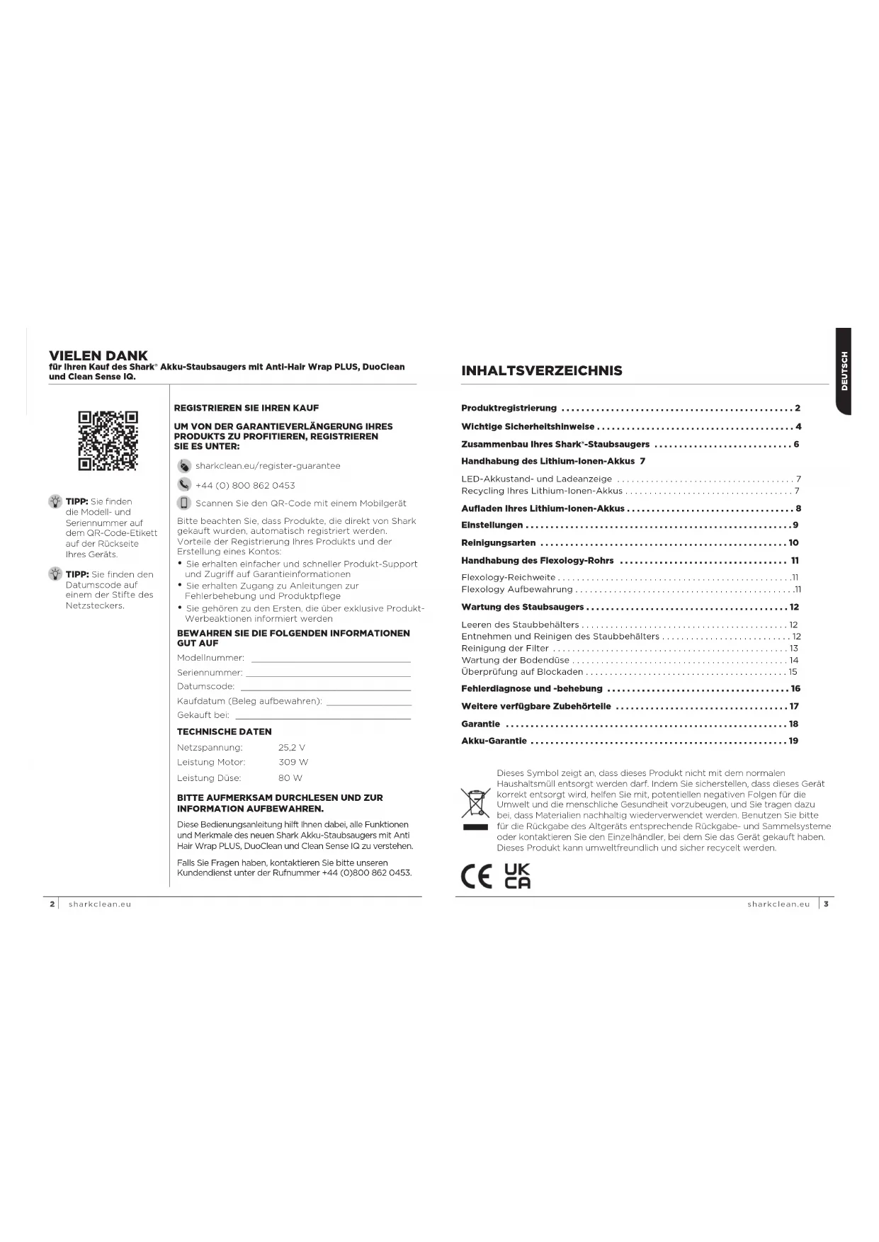 SIE ES UNTER: sharkclean.eu/register-guarantee +44 (0) 800 862 0453 Scannen Sie den QR-Code mit einem Mobilgerät VIELEN DANK für Ihren Kauf des Shark® Akku-Staubsaugers mit Anti-Hair Wrap PLUS, DuoClean und Clean Sense IQ.