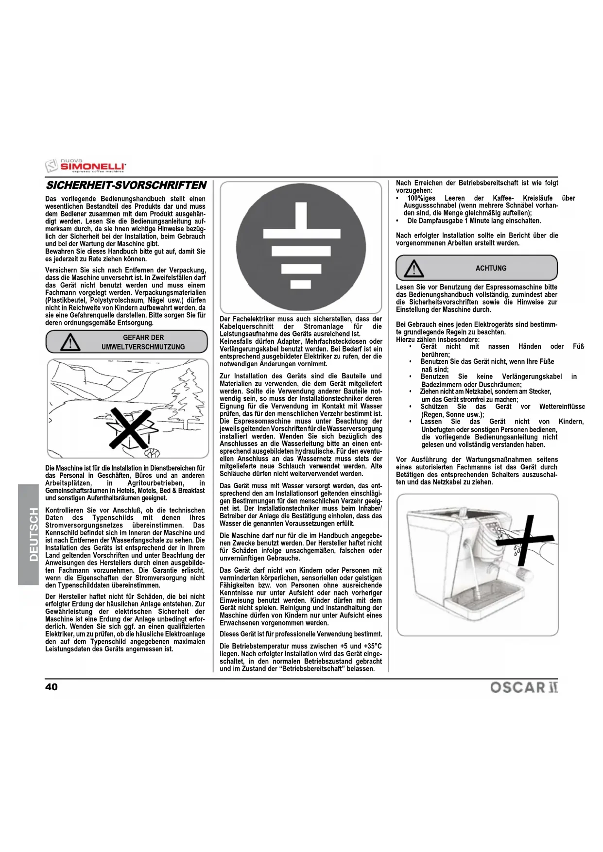 DEUTSCH SICHERHEIT-SVORSCHRIFTEN Das vorliegende Bedienungshandbuch stellt einen wesentlichen Bestandteil des Produkts dar und muss dem Bediener zusammen mit dem Produkt ausgehän- digt werden. Lesen Sie die Bedienungsanleitung auf- merksam durch, da sie hnen wichtige Hinweise bezüg- lich der Sicherheit bei der Installation, beim Gebrauch und bei der Wartung der Maschine gibt. Bewahren Sie dieses Handbuch bitte gut auf, damit Sie es jederzeit zu Rate ziehen können. Versichern Sie sich nach Entfernen der Verpackung, dass die Maschine unversehrt ist. In Zweifelsfällen darf das Gerät nicht benutzt werden und muss einem Fachmann vorgelegt werden. Verpackungsmaterialien (Plastikbeutel, Polystyrolschaum, Nägel usw.) dürfen nicht in Reichweite von Kindern aufbewahrt werden, da sie eine Gefahrenquelle darstellen. Bitte sorgen Sie für deren ordnungsgemäße Entsorgung. GEFAHR DER UMWELTVERSCHMUTZUNG Die Maschine ist für die Installation in Dienstbereichen für das Personal in Geschäften, Büros und an anderen Arbeitsplätzen, in Agritourbetrieben, in Gemeinschaftsräumen in Hotels, Motels, Bed & Breakfast und sonstigen Aufenthaltsräumen geeignet. Kontrollieren Sie vor Anschluß, ob die technischen Daten des Typenschilds mit denen Ihres Stromversorgungsnetzes übereinstimmen. Das Kennschild befindet sich im Inneren der Maschine und ist nach Entfernen der Wasserfangschale zu sehen. Die Installation des Geräts ist entsprechend der in Ihrem Land geltenden Vorschriften und unter Beachtung der Anweisungen des Herstellers durch einen ausgebilde- ten Fachmann vorzunehmen. Die Garantie erlischt, wenn die Eigenschaften der Stromversorgung nicht den Typenschilddaten übereinstimmen. Der Hersteller haftet nicht für Schäden, die bei nicht erfolgter Erdung der häuslichen Anlage entstehen. Zur Gewährleistung der elektrischen Sicherheit der Maschine ist eine Erdung der Anlage unbedingt erfor- derlich. Wenden Sie sich ggf. an einen qualifizierten Elektriker, um zu prüfen, ob die häusliche Elektroanlage den auf dem Typenschild angegebenen maximalen Leistungsdaten des Geräts angemessen ist. Der Fachelektriker muss auch sicherstellen, dass der Kabelquerschnitt der Stromanlage für die Leistungsaufnahme des Geräts ausreichend ist. Keinesfalls dürfen Adapter, Mehrfachsteckdosen oder Verlängerungskabel benutzt werden. Bei Bedarf ist ein entsprechend ausgebildeter Elektriker zu rufen, der die notwendigen Änderungen vornimmt. Zur Installation des Geräts sind die Bauteile und Materialien zu verwenden, die dem Gerät mitgeliefert werden. Sollte die Verwendung anderer Bauteile not- wendig sein, so muss der Installationstechniker deren Eignung für die Verwendung im Kontakt mit Wasser prüfen, das für den menschlichen Verzehr bestimmt ist. Die Espressomaschine muss unter Beachtung der jeweils geltenden Vorschriften für die Wasserversorgung installiert werden. Wenden Sie sich bezüglich des Anschlusses an die Wasserleitung bitte an einen ent- sprechend ausgebildeten hydraulische. Für den eventu- ellen Anschluss an das Wassernetz muss stets der mitgelieferte neue Schlauch verwendet werden. Alte Schläuche dürfen nicht weiterverwendet werden. Das Gerät muss mit Wasser versorgt werden, das ent- sprechend den am Installationsort geltenden einschlägi- gen Bestimmungen für den menschlichen Verzehr geeig- net ist. Der Installationstechniker muss beim Inhaber/ Betreiber der Anlage die Bestätigung einholen, dass das Wasser die genannten Voraussetzungen erfüllt. Die Maschine darf nur für die im Handbuch angegebe- nen Zwecke benutzt werden. Der Hersteller haftet nicht für Schäden infolge unsachgemäßen, falschen oder unvernünftigen Gebrauchs. Das Gerät darf nicht von Kindern oder Personen mit verminderten körperlichen, sensoriellen oder geistigen Fähigkeiten bzw. von Personen ohne ausreichende Kenntnisse nur unter Aufsicht oder nach vorheriger Einweisung benutzt werden. Kinder dürfen mit dem Gerät nicht spielen. Reinigung und Instandhaltung der Maschine dürfen von Kindern nur unter Aufsicht eines Erwachsenen vorgenommen werden. Dieses Gerät ist für professionelle Verwendung bestimmt. Die Betriebstemperatur muss zwischen +5 und +35°C liegen. Nach erfolgter Installation wird das Gerät einge- schaltet, in den normalen Betriebszustand gebracht und im Zustand der “Betriebsbereitschaft” belassen. Nach Erreichen der Betriebsbereitschaft ist wie folgt vorzugehen: