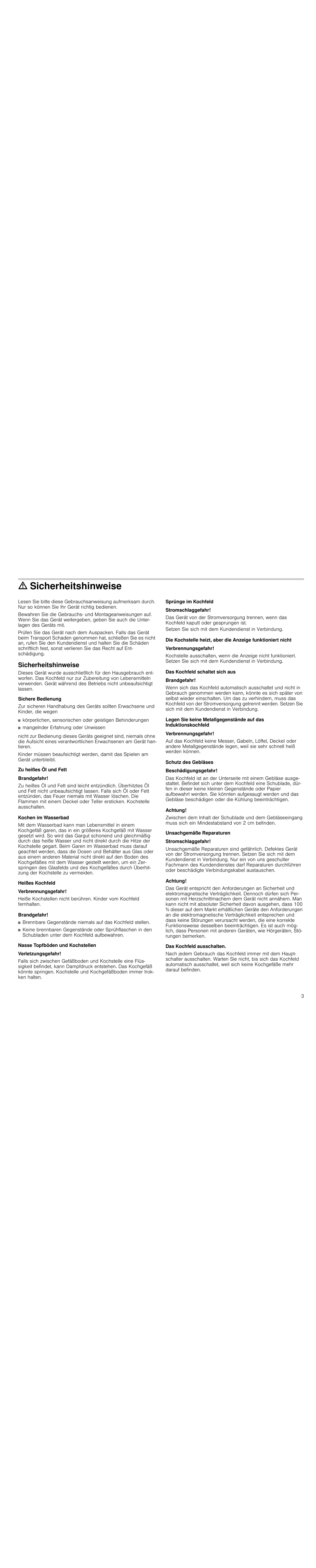 Ø Inhaltsverzeichnis Sicherheitshinweise 3 Sicherheitshinweise 3 Ursachen für Schäden 4 Umweltschutz 4 Umweltgerecht entsorgen 4 Tipps zum Energiesparen 4 Induktionskochen 4 Vorteile beim Induktionskochen4 Geeignete Kochgefäße 4 Das Gerät kennen lernen 5 Das Bedienfeld5 Die Kochstellen 6 Restwärmeanzeige 6 Kochfeld einstellen 6 Das Kochfeld ein- und ausschalten. 6 Kochstelle einrichten 6 Kochtabelle 7 Kindersicherung 8 Kindersicherung ein- und ausschalten 8 Ständige Kindersicherung ein- und ausschalten 8 Powerboost-Funktion 8 Gebrauchseinschränkungen8 Einschalten8