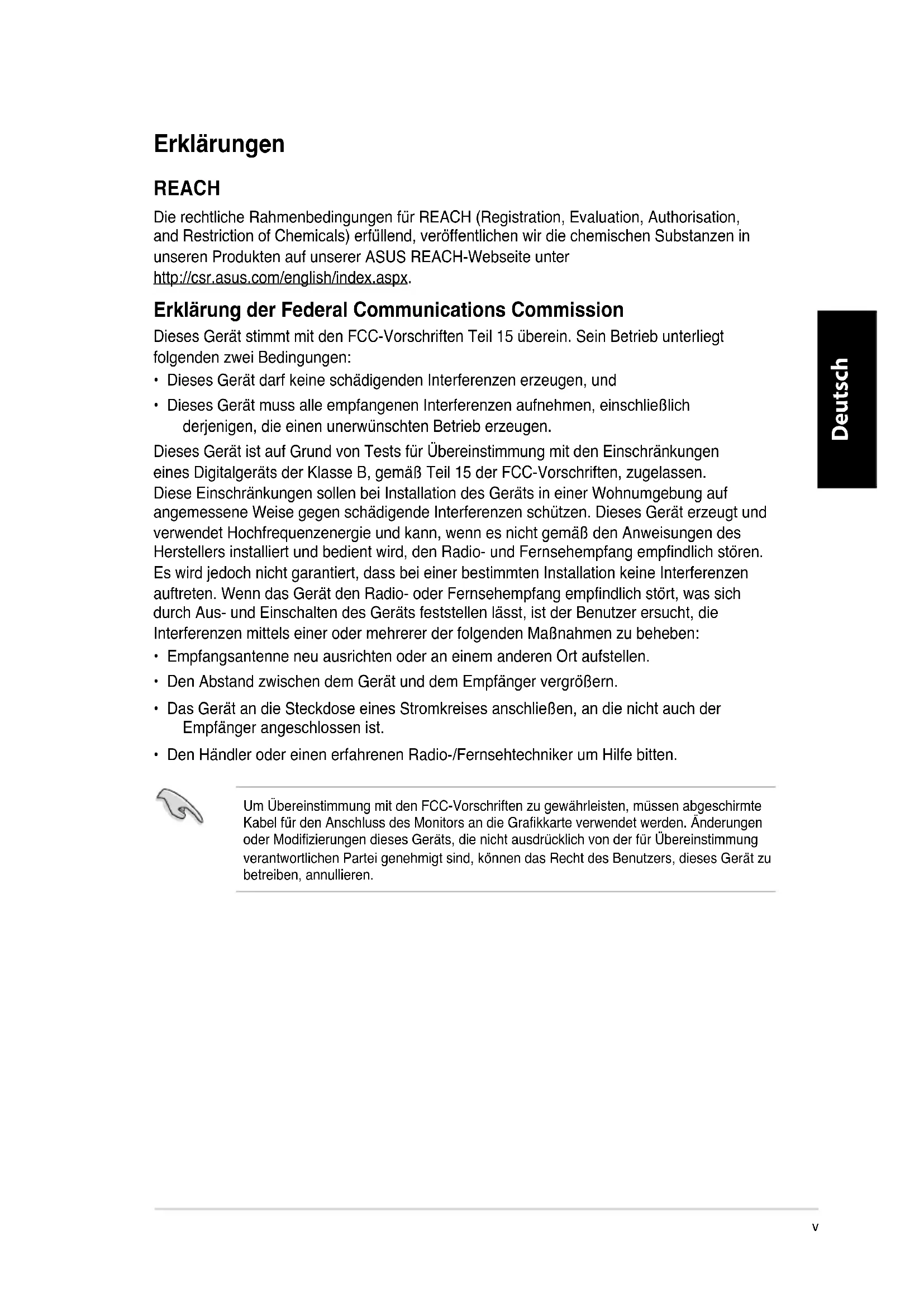 Systemwiederherstellung .......................................................................... 6-19 Kapitel 7 Problembehandlung Problembehandlung .................................................................................... 7-1v Deutsch Deutsch Deutsch Deutsch Erklärungen REACH Die rechtliche Rahmenbedingungen für REACH (Registration, Evaluation, Authorisation, and Restriction of Chemicals) erfüllend, veröffentlichen wir die chemischen Substanzen in unseren Produkten auf unserer ASUS REACH-Webseite unter http://csr.asus.com/english/index.aspx. Erklärung der Federal Communications Commission Dieses Gerät stimmt mit den FCC-Vorschriften Teil 15 überein. Sein Betrieb unterliegt folgenden zwei Bedingungen: