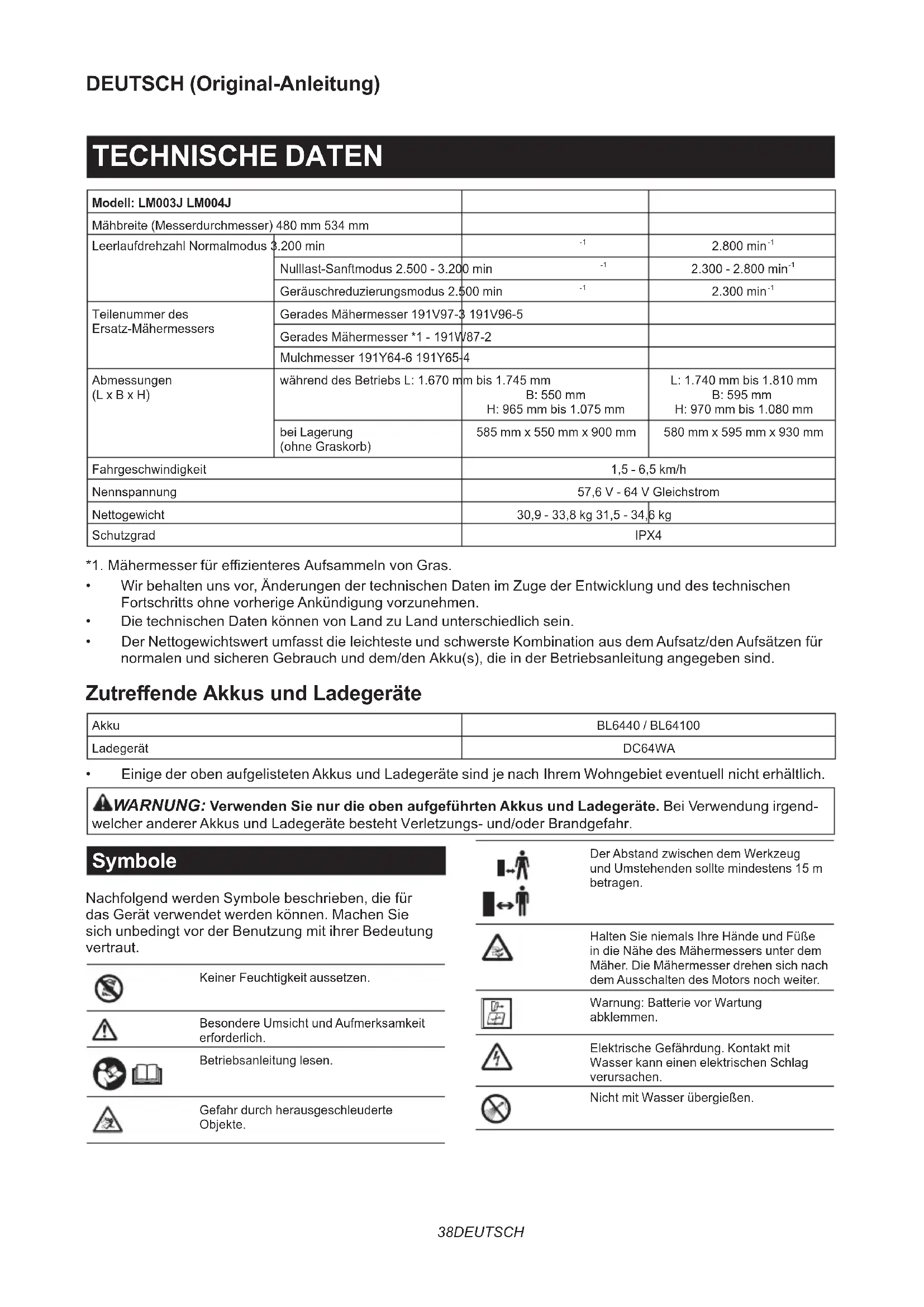 - Einige der oben aufgelisteten Akkus und Ladegeräte sind je nach Ihrem Wohngebiet eventuell nicht erhältlich. WARNUNG: Verwenden Sie nur die oben aufgeführten Akkus und Ladegeräte. Bei Verwendung irgend- welcher anderer Akkus und Ladegeräte besteht Verletzungs- und/oder Brandgefahr. Symbole Nachfolgend werden Symbole beschrieben, die für das Gerät verwendet werden können. Machen Sie sich unbedingt vor der Benutzung mit ihrer Bedeutung vertraut. Keiner Feuchtigkeit aussetzen. Besondere Umsicht und Aufmerksamkeit erforderlich. Betriebsanleitung lesen. Gefahr durch herausgeschleuderte Objekte. Der Abstand zwischen dem Werkzeug und Umstehenden sollte mindestens 15 m betragen. Halten Sie niemals Ihre Hände und Füße in die Nähe des Mähermessers unter dem Mäher. Die Mähermesser drehen sich nach dem Ausschalten des Motors noch weiter. Warnung: Batterie vor Wartung abklemmen. Elektrische Gefährdung. Kontakt mit Wasser kann einen elektrischen Schlag verursachen. Nicht mit Wasser übergießen.39 DEUTSCH Ni-MH Li-ion Nur für EU-Länder Aufgrund des Vorhandenseins gefähr- licher Komponenten in der Ausrüstung können Elektro- und Elektronik-Altgeräte, Akkumulatoren und Batterien sich nega- tiv auf die Umwelt und die menschliche Gesundheit auswirken. Entsorgen Sie Elektro- und Elektronikgeräte oder Batterien nicht mit dem Hausmüll! In Übereinstimmung mit der Europäischen Richtlinie über Elektro- und Elektronik- Altgeräte, Akkumulatoren und Batterien, verbrauchte Akkumulatoren und Batterien sowie ihrer Anpassung an nati- onales Recht sollten Elektro-Altgeräte, Batterien und Akkumulatoren gemäß den Umweltschutzbestimmungen getrennt gelagert und zu einer getrennten Sammelstelle für Siedlungsabfälle geliefert werden. Dies wird durch das am Gerät angebrachte Symbol der durchgestrichenen Abfalltonne auf Rädern angezeigt. Garantierter Schallleistungspegel gemäß der EU-Richtlinie über Außenlärm. Schallleistungspegel gemäß der australi- schen NSW-Lärmschutzverordnung Vorgesehene Verwendung Die Maschine ist für Rasenmähen vorgesehen. Geräusch Typischer A-bewerteter Geräuschpegel ermittelt gemäß EN62841-4-3: Modell LM003J Gemessener Schallleistungspegel (L