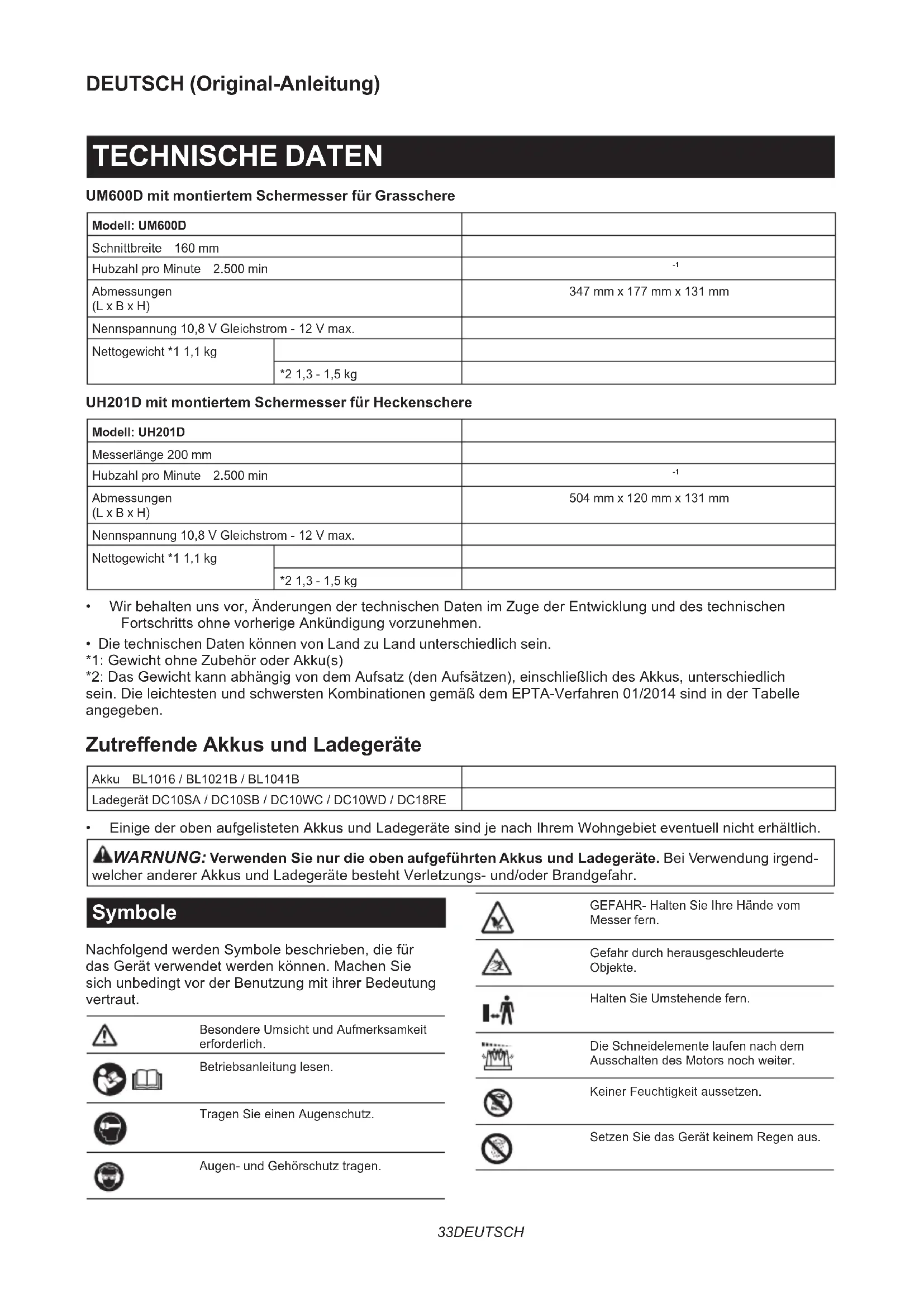 - EinigederobenaufgelistetenAkkusundLadegerätesindjenachIhremWohngebieteventuellnichterhältlich. WARNUNG: Verwenden Sie nur die oben aufgeführten Akkus und Ladegeräte. Bei Verwendung irgend- welcherandererAkkusundLadegerätebestehtVerletzungs-und/oderBrandgefahr. Symbole NachfolgendwerdenSymbolebeschrieben,diefür dasGerätverwendetwerdenkönnen.MachenSie sichunbedingtvorderBenutzungmitihrerBedeutung vertraut. BesondereUmsichtundAufmerksamkeit erforderlich. Betriebsanleitunglesen. TragenSieeinenAugenschutz. Augen-undGehörschutztragen. GEFAHR-HaltenSieIhreHändevom Messer fern. Gefahrdurchherausgeschleuderte Objekte. Halten Sie Umstehende fern. Die Schneidelemente laufen nach dem AusschaltendesMotorsnochweiter. KeinerFeuchtigkeitaussetzen. SetzenSiedasGerätkeinemRegenaus.34 DEUTSCH Ni-MH Li-ion NurfürEU-Länder AufgrunddesVorhandenseinsgefähr- licherKomponenteninderAusrüstung könnenElektro-undElektronik-Altgeräte, AkkumulatorenundBatteriensichnega- tiv auf die Umwelt und die menschliche Gesundheitauswirken. EntsorgenSieElektro-und ElektronikgeräteoderBatteriennichtmit demHausmüll! InÜbereinstimmungmitderEuropäischen RichtlinieüberElektro-undElektronik- Altgeräte,AkkumulatorenundBatterien, verbrauchteAkkumulatorenund BatteriensowieihrerAnpassungannati- onalesRechtsolltenElektro-Altgeräte, BatterienundAkkumulatorengemäß denUmweltschutzbestimmungen getrennt gelagert und zu einer getrennten SammelstellefürSiedlungsabfällegeliefert werden. DieswirddurchdasamGerätangebrachte SymbolderdurchgestrichenenAbfalltonne auf Rädern angezeigt. GarantierterSchallleistungspegelgemäß derEU-RichtlinieüberAußenlärm. Schallleistungspegelgemäßderaustrali- schen NSW-Lärmschutzverordnung Vorgesehene Verwendung UM600D mit montiertem Schermesser für Grasschere Das Werkzeug ist zum Schneiden von Rasenkanten oderTriebenvorgesehen. UH201D mit montiertem Schermesser für Heckenschere Das Werkzeug ist zum Trimmen von Hecken vorgesehen. Geräusch TypischerA-bewerteterGeräuschpegelermitteltgemäßEN62841-4-5: UM600D/UH201D mit montiertem Schermesser für Grasschere Schalldruckpegel