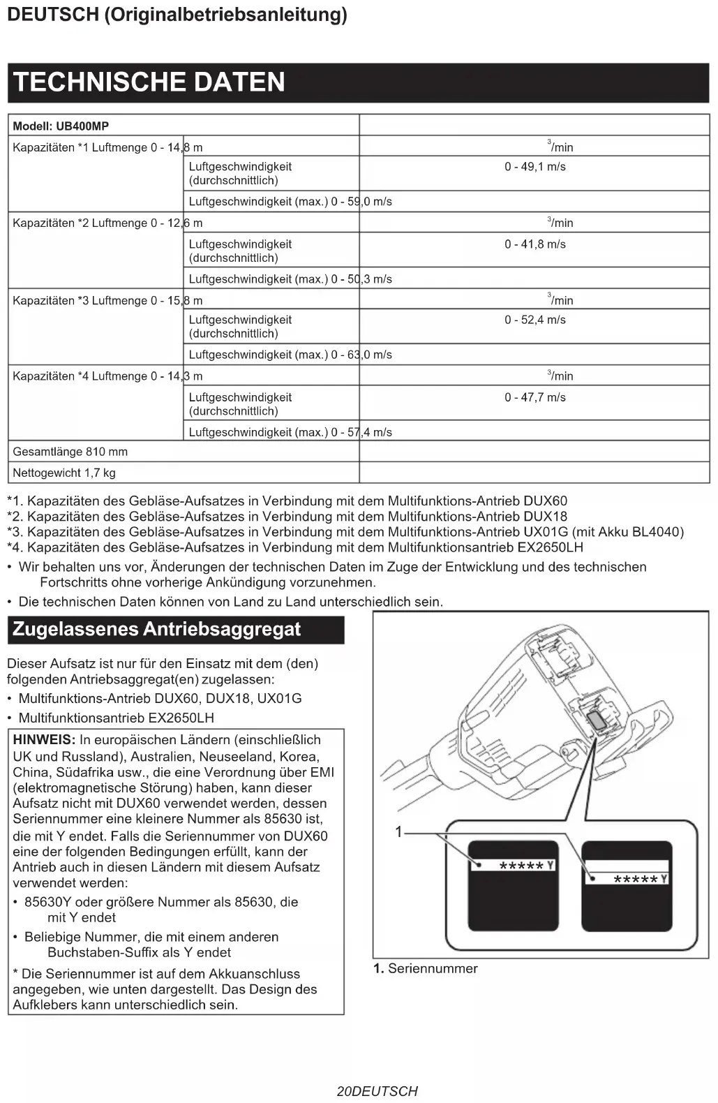 - Multifunktionsantrieb EX2650LH HINWEIS: In europäischen Ländern (einschließlich UK und Russland), Australien, Neuseeland, Korea, China, Südafrika usw., die eine Verordnung über EMI (elektromagnetische Störung) haben, kann dieser Aufsatz nicht mit DUX60 verwendet werden, dessen Seriennummer eine kleinere Nummer als 85630 ist, die mit Y endet. Falls die Seriennummer von DUX60 eine der folgenden Bedingungen erfüllt, kann der Antrieb auch in diesen Ländern mit diesem Aufsatz verwendet werden:
