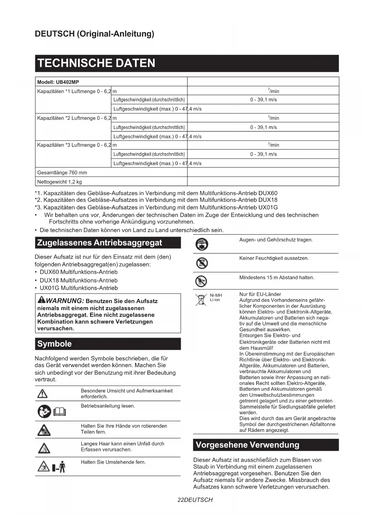 - UX01G Multifunktions-Antrieb WARNUNG: Benutzen Sie den Aufsatz niemals mit einem nicht zugelassenen Antriebsaggregat. Eine nicht zugelassene Kombination kann schwere Verletzungen verursachen. Symbole NachfolgendwerdenSymbolebeschrieben,diefür das Gerät verwendet werden können. Machen Sie sich unbedingt vor der Benutzung mit ihrer Bedeutung vertraut. Besondere Umsicht und Aufmerksamkeit erforderlich. Betriebsanleitung lesen. Halten Sie Ihre Hände von rotierenden Teilen fern. Langes Haar kann einen Unfall durch Erfassenverursachen. Halten Sie Umstehende fern. Augen- und Gehörschutz tragen. Keiner Feuchtigkeit aussetzen. Mindestens 15 m Abstand halten. Ni-MH Li-ion NurfürEU-Länder Aufgrund des Vorhandenseins gefähr- licher Komponenten in der Ausrüstung könnenElektro-undElektronik-Altgeräte, Akkumulatoren und Batterien sich nega- tiv auf die Umwelt und die menschliche Gesundheit auswirken. EntsorgenSieElektro-und ElektronikgeräteoderBatteriennichtmit dem Hausmüll! InÜbereinstimmungmitderEuropäischen RichtlinieüberElektro-undElektronik- Altgeräte, Akkumulatoren und Batterien, verbrauchte Akkumulatoren und Batterien sowie ihrer Anpassung an nati- onalesRechtsolltenElektro-Altgeräte, Batterien und Akkumulatoren gemäß den Umweltschutzbestimmungen getrennt gelagert und zu einer getrennten Sammelstelle für Siedlungsabfälle geliefert werden. Dies wird durch das am Gerät angebrachte SymbolderdurchgestrichenenAbfalltonne auf Rädern angezeigt. Vorgesehene Verwendung Dieser Aufsatz ist ausschließlich zum Blasen von Staub in Verbindung mit einem zugelassenen Antriebsaggregat vorgesehen. Benutzen Sie den Aufsatz niemals für andere Zwecke. Missbrauch des Aufsatzes kann schwere Verletzungen verursachen.23 DEUTSCH EG-Konformitätserklärung Nur für europäische Länder Wir als die Hersteller: Makita Europe N.V., Geschäftsadresse: Jan-Baptist Vinkstraat 2 3070 Kortenberg BELGIEN. Beauftragen Hiroshi Tsujimura mit der Zusammenstellung der technischen Dokumentation und erklären unter unserer alleinigen Verantwortung,dassdas(die)Produkt(e); Bezeichnung: Gebläse-Aufsatz. Bezeichnung des Typs(derTypen):UB402MP. alle relevanten Vorschriften von 2006/42/EG sowie allerelevantenVorschriftenderfolgendenEG/ EU-Richtlinienerfüllt(erfüllen):2000/14/EG und gemäß den folgenden harmonisierten Normen gefertigt ist (sind): EN 60335-1:2012+A11:2014+A13:2017+A1:20 19+A14:2019+A2:2019, EN 50636-2-100:2014. OrtundDatumderErklärung:Kortenberg, Belgien.