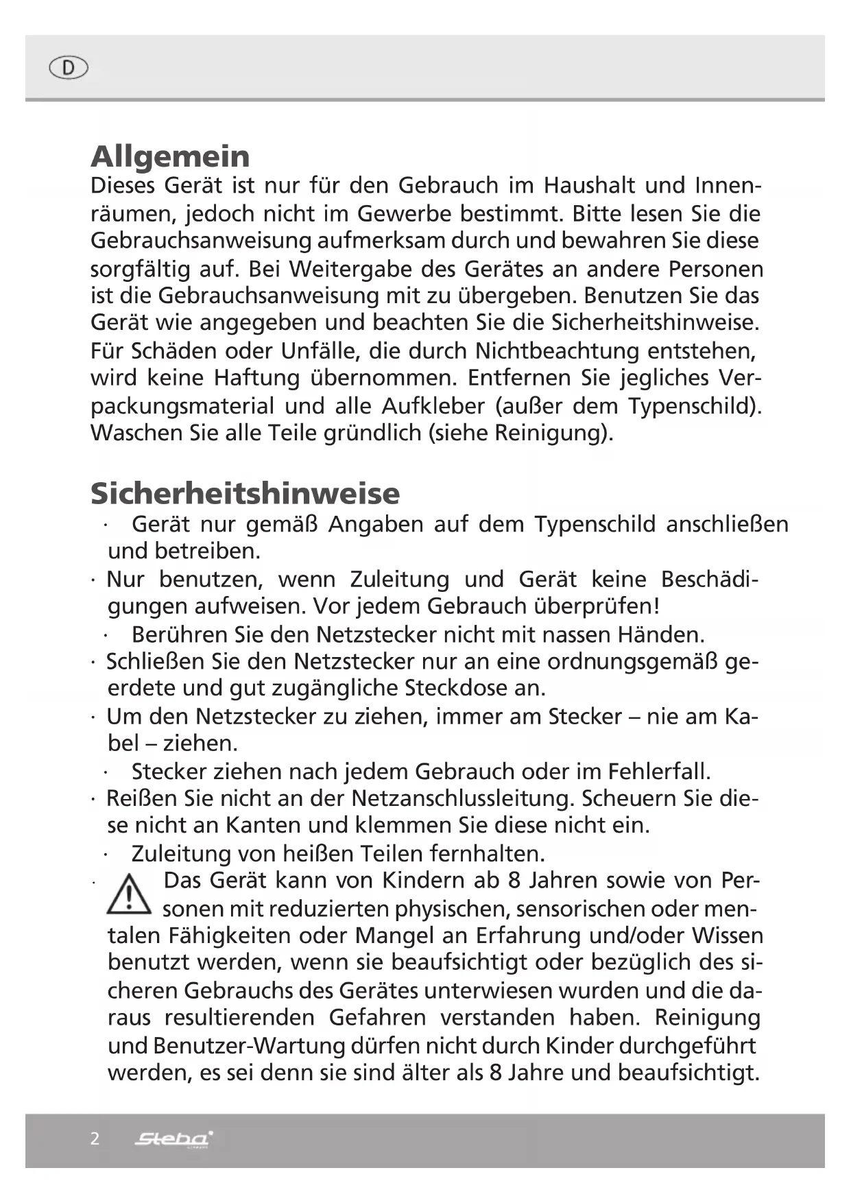 Joghurt griechischer Art 1,5 l Milch 3,5% 150g griechischen Joghurt 125g Sahne Milch, Joghurt und Sahne vermischen und in den großen Behälter füllen. Deckel auflegen, in das Gerät stellen und das „YOGHURT“-Programm wählen. Die Reifezeit beträgt ca. 10 Stunden. Nach der Reifezeit muss der Joghurt von der Molke getrennt werden. Geben Sie den Joghurt dazu in das Abtropfsieb des Glasbehälters B und lassen Sie ihn dort nach Geschmack abtropfen. Joghurt isländischer Art (Skyr) 1,5 l Milch 1,5% 150g Skyr-Joghurt Milch und Joghurt vermischen und in den großen Behälter füllen. Deckel auflegen, in das Gerät stellen und das „YOGHURT“-Programm wählen. Die Reifezeit beträgt ca. 12 Stunden. Überprüfen Sie dann die Festigkeit des Joghurts und verlängern Sie ggf. die Reifezeit. Veganer Joghurt 1,5 l Sojamilch (oder auch Nuss-, Hafer- oder andere Milchalternativen) 150g Soja-Joghurt (alternativ Joghurtkulturen) Milch und Joghurt vermischen und in den großen Behälter füllen. Deckel auflegen, in das Gerät stellen und das „VEGAN“-Programm wählen. Die Reifezeit beträgt ca. 10 Stunden. Überprüfen Sie dann die Festigkeit des Joghurts und verlängern Sie ggf. die Reifezeit. Frischkäse 1,5 l Milch 3,5% 150g Joghurt 3,5% 1 EL Zitronensaft Milch, Joghurt und Zitronensaft vermischen und in den großen Behälter füllen. Deckel auflegen, in das Gerät stellen und das „CHEESE“- Programm wählen. Die Reifezeit beträgt ca. 5 Stunden. Nach der Reifezeit muss der Frischkäse von der Molke getrennt werden. Geben Sie den Frischkäse dazu in das Abtropfsieb des Glasbehälters B und lassen Sie ihn dort für ca. 8-10 Stunden im Kühlschrank abtropfen. Je länger der Frischkäse abtropft, desto trockener wird er. Würzen Sie den Frischkäse vor der Verzehr nach Belieben mit Gewürzen und Kräutern.10 Kimchi – koreanisches fermentiertes Gemüse 1 Chinakohl 1 mittelgroße Karotte 1 kleinen Rettich oder einige Radieschen 1 EL Salz 1 TL Zucker 1 Tasse Gemüsebrühe 2 – 3 Knoblauchzehen 1 – 2 TL Chili Den Chinakohl vierteln und grob schneiden. Den Kohl mit Salz und Zucker bestreuen, für ca. 5 Minuten leicht kneten und etwas einwirken lassen. Anschließend die ausgetretene Flüssigkeit abgießen. Karotte und Rettich in Streifen schneiden, den Knoblauch in dünne Scheiben. Nun alle Zutaten miteinander vermengen, in den großen Glasbehälter geben und leicht andrücken. Den Ventildeckel aufsetzen und das Ventil nach unten drücken. Deckel auflegen, in das Gerät stellen und das „FERMENT“-Programm wählen. Die Reifezeit beträgt ca. 48 Stunden. Gewürzöle 1,6 l Raps- oder Sonnenblumenöl Chiliöl: 10 – 15 Chilli, getrocknet Knoblauchöl: 8 – 10 Knoblauchzehen Knoblauch-Peperoniöl: 4 – 5 Knoblauchzehen 4 – 5 Peperoni Kräuteröl: 8 zweige Thymian 5 Zweige Rosmarin 3 Lorbeerblätter Die Zutaten fein schneiden oder hacken und in den Einsatz Nr. 4 füllen. Den Ventildeckel aufsetzen und das Ventil nach unten drücken. Das Öl in den großen Glasbehälter füllen und den Einsatz einhängen. Deckel auflegen, in das Gerät stellen und das „HERBS“-Programm wählen. Die Reifezeit beträgt ca. 4 Stunden. Nach Programmende das ÖL mit Einsatz abkühlen lassen. Anschließend das Öl in ein Schraubgefäß umfüllen und kühl und dunkel lagern.11 Korrekte Entsorgung dieses Produkts: Ausgediente Geräte sofort unbrauchbar machen. Innerhalb der EU weist dieses Symbol darauf hin, dass dieses Produkt nicht über den Hausmüll entsorgt werden darf. Altgeräte enthalten wertvolle recy- clingfähige Materialien, die einer Wiederverwertung zugeführt werden soll- ten und um der Umwelt bzw. der menschlichen Gesundheit nicht durch un- kontrollierte Müllbeseitigung zu schaden. Bitte entsorgen Sie Altgeräte deshalb über geeignete Sammelsysteme oder senden Sie das Gerät zur Entsorgung an die Stelle, bei der Sie es gekauft haben. Diese wird dann das Gerät der stofflichen Verwertung zuführen. Verpackungs-Entsorgung Wenn möglich heben Sie die Verpackung auf um im Falle einer Garantie das Gerät zurückschicken zu können. Verpackungsmaterial nicht einfach wegwerfen, sondern der Wiederverwertung zuführen. Papier-, Pappe- und Wellpappeverpackungen bei Altpapiersammelstellen abgeben. Kunststoffverpackungsteile und Folien sollten ebenfalls in die dafür vorgesehenen Sammelbehälter gegeben werden. In den Beispielen für die Kunststoffkennzeichnung steht: PE für Polyethylen, die Kennziffer 02 für PE-HD, 04 für PE-LD, PP für Poly- propylen, PS für Polystyrol. Kundenservice: Sollte Ihr Gerät wider Erwarten einmal den Kundendienst benötigen, wenden Sie sich bitte an nachfolgende Anschrift. Wir werden dann im Garantiefall die Abholung veranlassen. Das Gerät muss transportfähig verpackt sein. Unfreie Pakete können nicht angenommen werden! STEBA Elektrogeräte GmbH & Co KG Pointstr. 2, 96129 Strullendorf / Germany Vertrieb-Tel.: 09543 / 449-17 / -18, Service-Tel.: 09543 / 449-44, Fax: 09543 / 449-19 E-Mail: elektro@steba.com Internet: http://www.steba.com Achtung! Elektrogeräte dürfen nur durch Elektro-Fachkräfte repariert werden, da durch unsachgemäße Reparaturen erhebliche Folgeschäden entstehen können.12 Generally This appliance is for private and indoor use only and must not be used commercially. Please read the instruction manual carefully and keep it at a safe place. When the appliance is given to ano- ther person the instruction manual should be passed to that per- son, too. Only use the appliance as described in the instruction manual and pay attention to the safety information. No liability for damages or accidents will be accepted, which are caused by not paying attention to the instruction manual. Remove all pa- ckaging and sticker (except the rating label). Wash up all parts carefully (see cleaning). Safety information ∙ Connect and operate the appliance in accordance with the specifications shown on the rating label. ∙ Do not use if the plug cord is damaged. Verify be