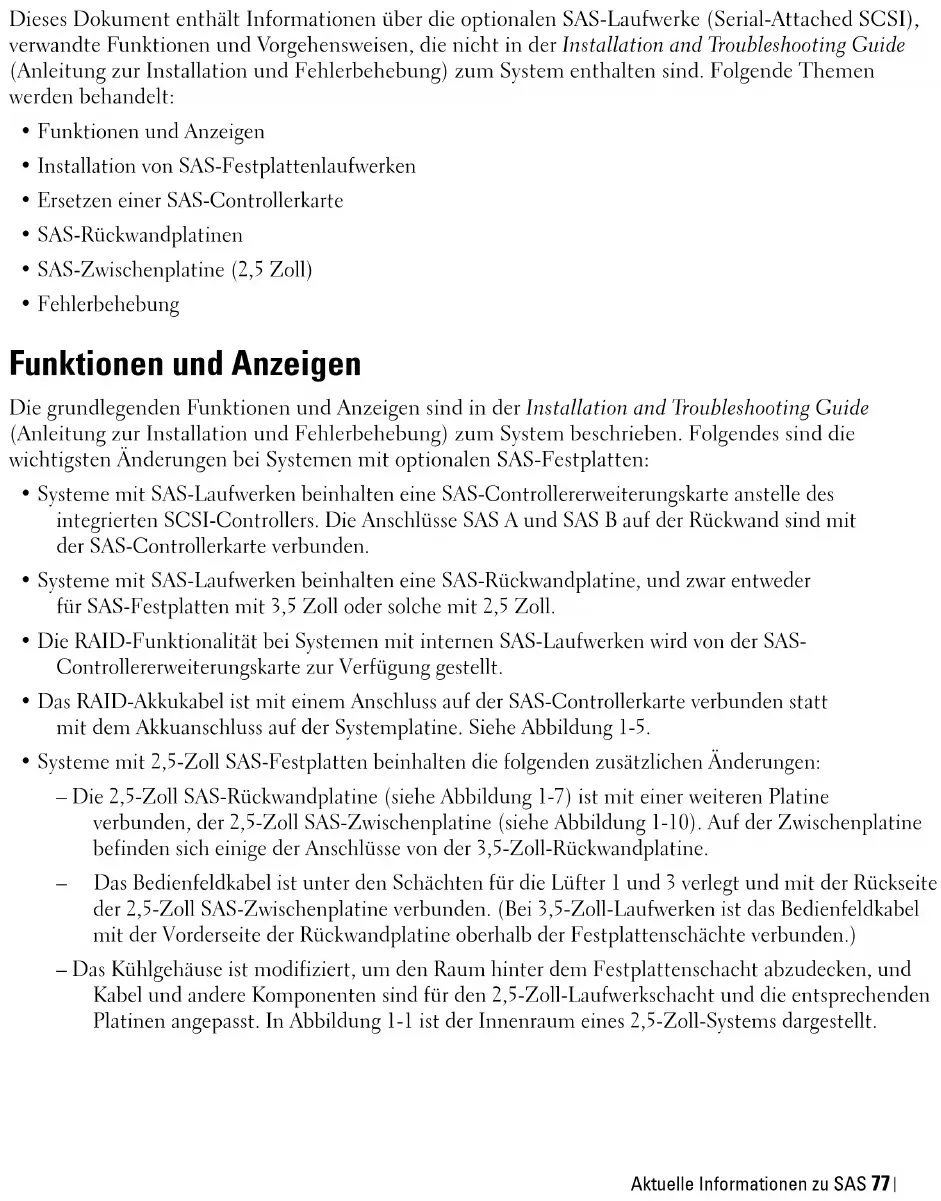 Fehlerbehebung bei einer SAS-Controllerkarte . . . . . . . . . . . . . . 9876 InhaltAktuelle Informationen zu SAS 77 Dieses Dokument enthält Informationen über die optionalen SAS-Laufwerke (Serial-Attached SCSI), verwandte Funktionen und Vorgehensweisen, die nicht in der Installation and Troubleshooting Guide (Anleitung zur Installation und Fehlerbehebung) zum System enthalten sind. Folgende Themen werden behandelt: