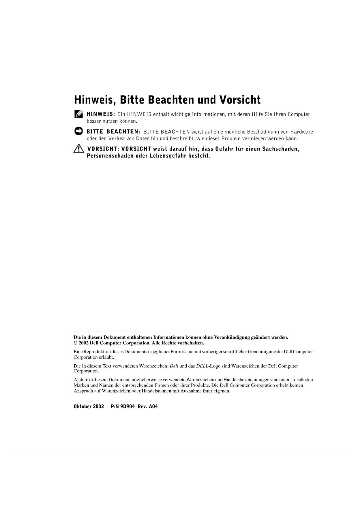 Accédez au programme de configuration du système (System Setup) et vérifiez que les catégories du microprocesseur correspondent bien à la nouvelle configuration. Pour plus d'informations sur le programme System Setup, reportez-vous au Guide de l'utilisateur. 19 Exécutez les diagnostics du système pour vérifier que le nouveau microprocesseur fonctionne correctement. Reportez-vous au Guide d'installation et de dépannage pour plus d'informations sur l'exécution des diagnostics et du dépannage des problèmes éventuels. 9D904fb4.fm Page 6 Tuesday, October 1, 2002 10:35 PMwww.dell.com | support.dell.com Dell™-Systeme Installationsanleitung für Mikroprozessor-Upgrades 9D904gt4.fm Page 1 Tuesday, October 1, 2002 10:57 PMHinweis, Bitte Beachten und Vorsicht HINWEIS: Ein HINWEIS enthält wichtige Informationen, mit deren Hilfe Sie Ihren Computer besser nutzen können. BITTE BEACHTEN: BITTE BEACHTEN weist auf eine mögliche Beschädigung von Hardware oder den Verlust von Daten hin und beschreibt, wie dieses Problem vermieden werden kann. VORSICHT: VORSICHT weist darauf hin, dass Gefahr für einen Sachschaden, Personenschaden oder Lebensgefahr besteht. Die in diesem Dokument enthaltenen Informationen können ohne Vorankündigung geändert werden. © 2002 Dell Computer Corporation. Alle Rechte vorbehalten. Eine Reproduktion dieses Dokuments in jeglicher Form ist nur mit vorheriger schriftlicher Genehmigung der Dell Computer Corporation erlaubt. Die in diesem Text verwendeten Warenzeichen: Dell und das DELL-Logo sind Warenzeichen der Dell Computer Corporation. Andere in diesem Dokument möglicherweise verwendete Warenzeichen und Handelsbezeichnungen sind unter Umständen Marken und Namen der entsprechenden Firmen oder ihrer Produkte. Die Dell Computer Corporation erhebt keinen Anspruch auf Warenzeichen oder Handelsnamen mit Ausnahme ihrer eigenen. Oktober 2002 P/N 9D904 Rev. A04 9D904gt4.fm Page 2 Tuesday, October 1, 2002 10:57 PMInstallationsanleitung für Mikroprozessor-Upgrades 4-1 Dieses Dokument enthält eine Anleitung für das Hinzufügen oder Ersetzen von Mikroprozessoren. Um von zukünftigen Verbesserungen hinsichtlich der Geschwindigkeit und neuer Optionen profitieren zu können, können Sie zusätzliche (sekundäre) Mikroprozessoren installieren oder die installierten Prozessoren austauschen. BITTE BEACHTEN: Bevor Sie einen Mikroprozessor hinzufügen oder austauschen, überprüfen Sie die aktuellsten System-BIOS-Informationen auf der Dell Support- Website unter support.dell.com und aktualisieren Sie Ihr BIOS, falls erforderlich. Jeder Mikroprozessor und der zugehörige Cache-Speicher sind in einem PGA-Paket (Pin- Grid Array) enthalten, das in einem ZIF-Sockel auf der Mikroprozessor-Platine installiert ist. Im folgenden Unterabschnitt wird beschrieben, wie der Mikroprozessor im Sockel des primären oder sekundären Mikroprozessors eingebaut oder ausgetauscht wird. HINWEIS: In einem System mit nur einem Mikroprozessor muss der Prozessor im primären Prozessorsockel installiert sein. Hinzufügen oder Austauschen eines Mikroprozessors BITTE BEACHTEN: Die sekundären Mikroprozessoren müssen vom gleichen Typ sein wie der primäre Mikroprozessor und die gleiche Taktfrequenz wie dieser haben. Wenn die Mikroprozessoren unterschiedliche Taktfrequenzen haben, arbeiten sie alle mit der Taktfrequenz des langsameren Prozessors. Neben dem ZIF-Sockel für den primären Mikroprozessor befinden sich auf der Systemplatine möglicherweise weitere ZIF-Sockel für sekundäre Mikroprozessoren. Das Mikroprozessor-Upgrade-Kit enthält die folgenden Teile: