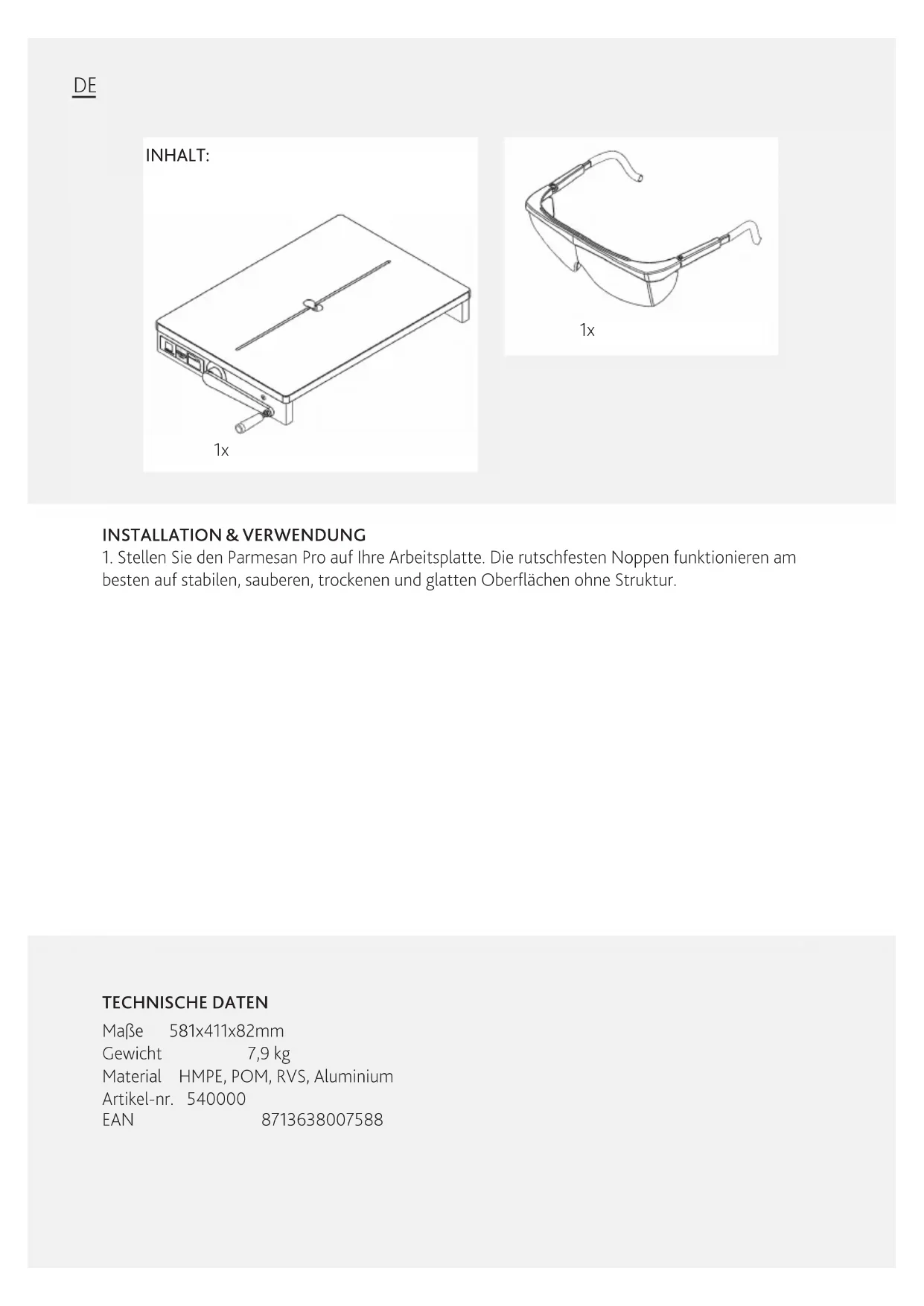 - Der Parmesan Pro ist ausschließlich zum Schneiden von Parmesan.