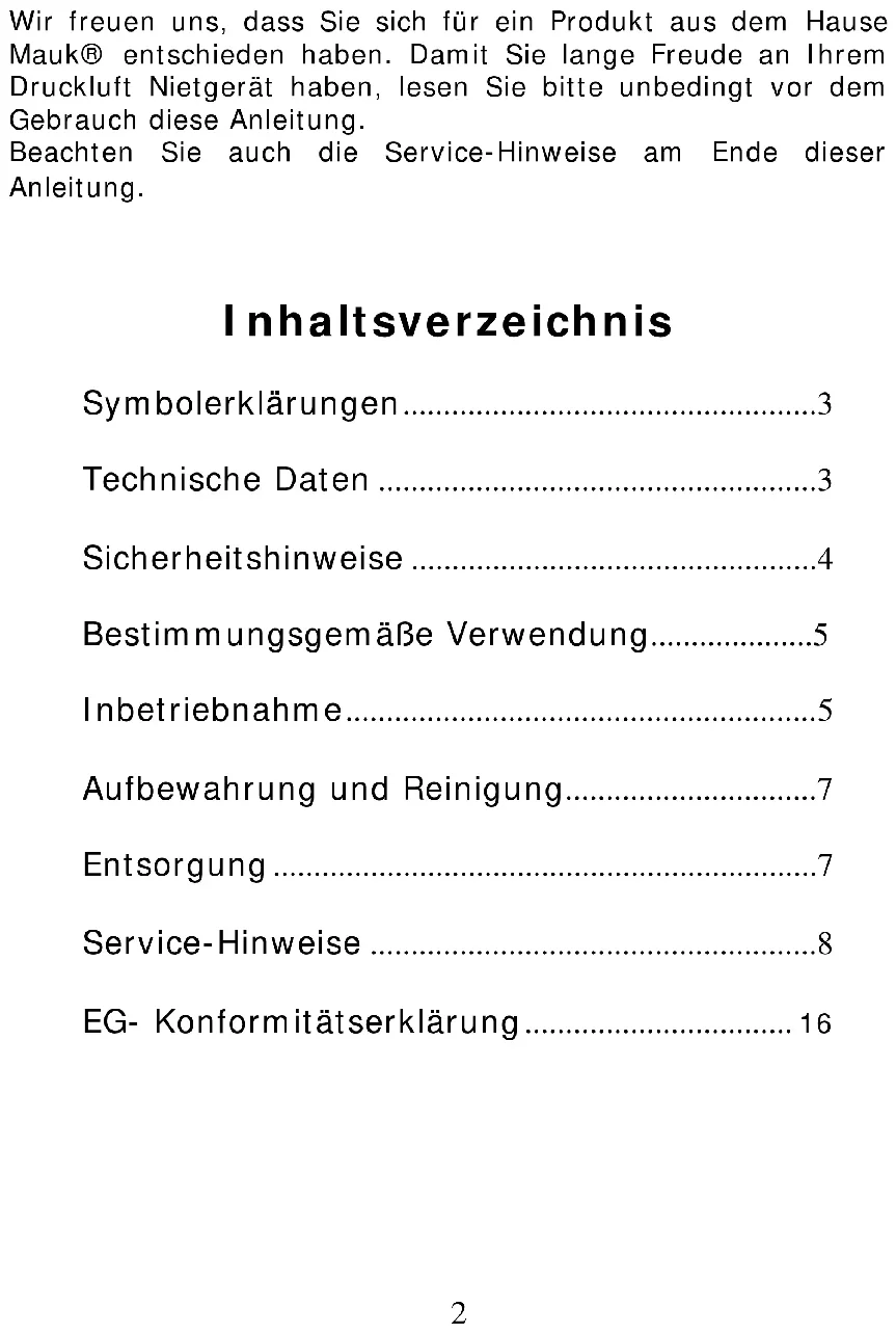 Bedienungsanleitung (Original) Druckluft-Blindnietgerät (Art. 819) Modell: LT3362 Wir freuen uns, dass Sie sich für ein Produkt aus dem Hause Mauk® entschieden haben. Damit Sie lange Freude an Ihrem Druckluft Nietgerät haben, lesen Sie bitte unbedingt vor dem Gebrauch diese Anleitung. Beachten Sie auch die Service-Hinweise am Ende dieser Anleitung.