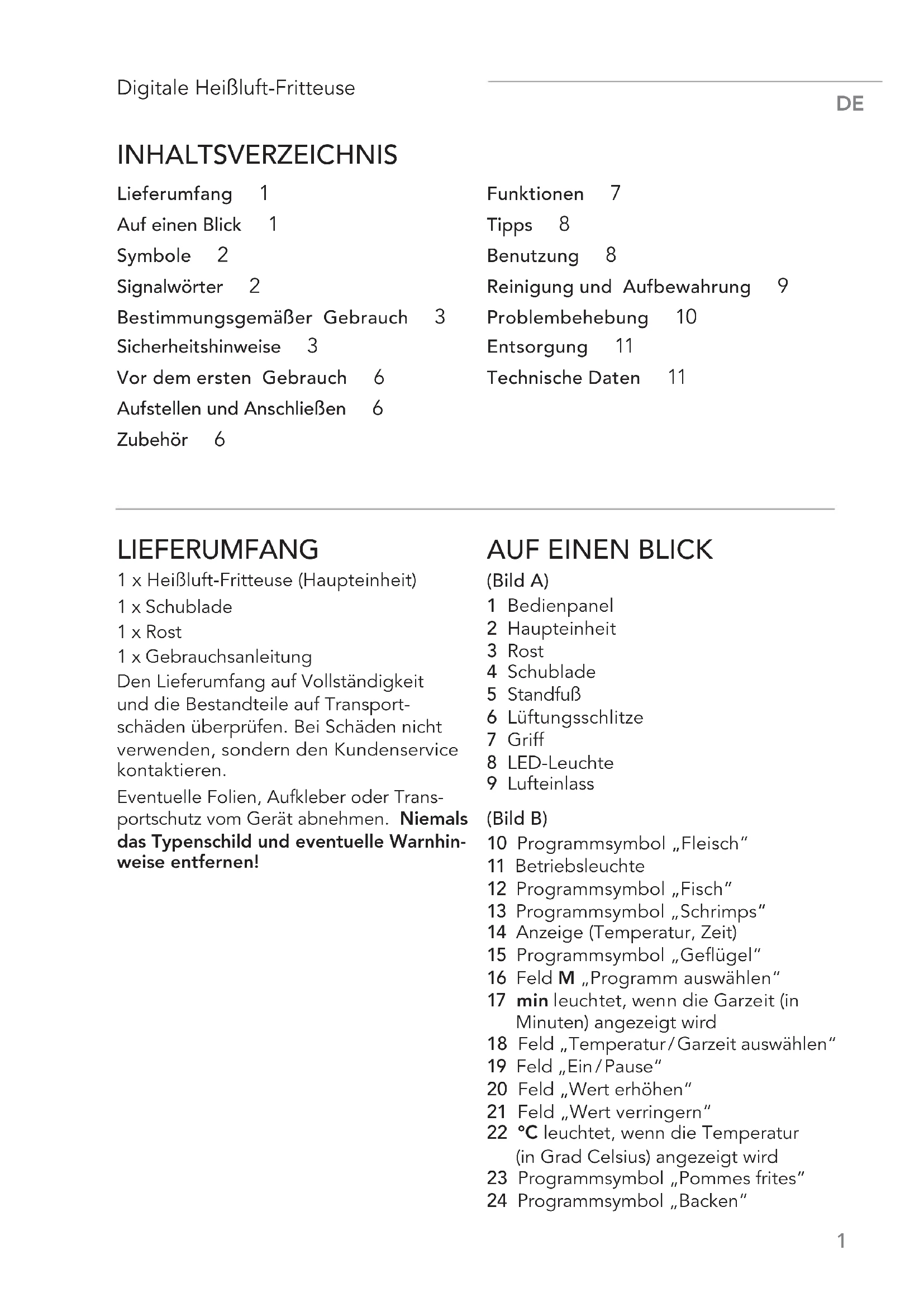 INHALTSVERZEICHNIS Lieferumfang 1 Auf einen Blick 1 Symbole 2 Signalwörter 2 Bestimmungsgemäßer Gebrauch 3 Sicherheitshinweise 3 Vor dem ersten Gebrauch 6 Aufstellen und Anschließen 6 Zubehör 6 Funktionen 7 Tipps 8 Benutzung 8 Reinigung und Aufbewahrung 9 Problembehebung 10 Entsorgung 11 Technische Daten 11 LIEFERUMFANG 1 x Heißluft-Fritteuse (Haupteinheit) 1 x Schublade 1 x Rost 1 x Gebrauchsanleitung Den Lieferumfang auf Vollständigkeit und die Bestandteile auf Transport- schäden überprüfen. Bei Schäden nicht verwenden, sondern den Kundenservice kontaktieren. Eventuelle Folien, Aufkleber oder Trans- portschutz vom Gerät abnehmen. Niemals das Typenschild und eventuelle Warnhin- weise entfernen!