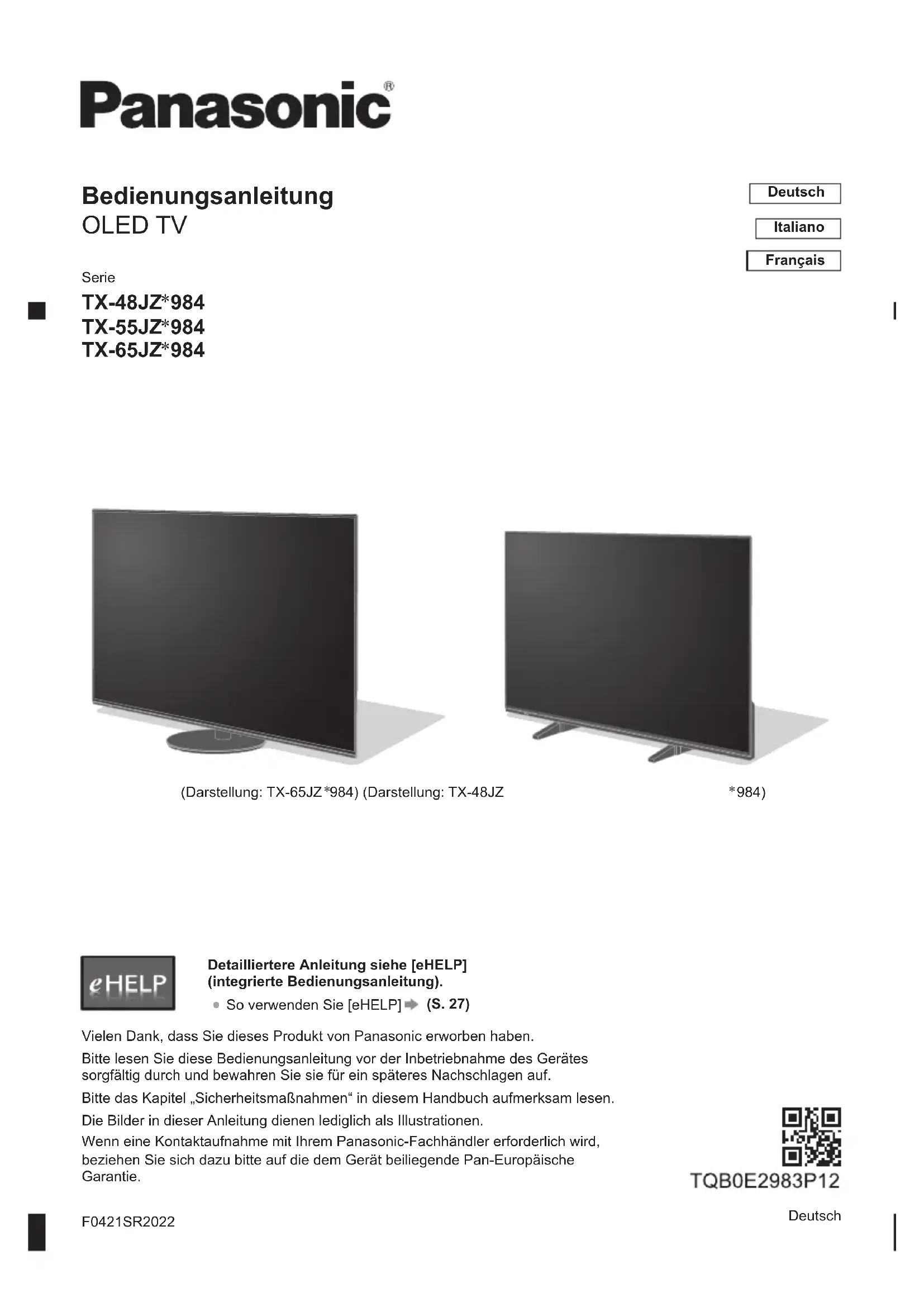 Finden Sie kostenlos die Bedienungsanleitung des Geräts TX-55JZC984 PANASONIC als PDF.
