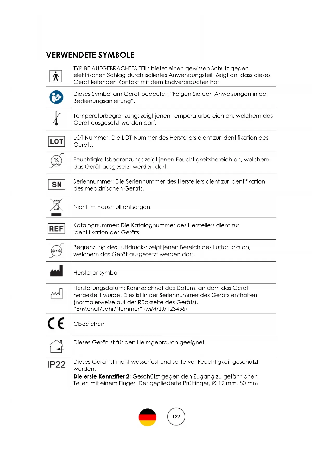 Temperaturbegrenzung: zeigt jenen Temperaturbereich an, welchem das Gerät ausgesetzt werden darf. LOT Nummer: Die LOT-Nummer des Herstellers dient zur Identifikation des Geräts. Feuchtigkeitsbegrenzung: zeigt jenen Feuchtigkeitsbereich an, welchem das Gerät ausgesetzt werden darf. Seriennummer: Die Seriennummer des Herstellers dient zur Identifikation des medizinischen Geräts. Nicht im Hausmüll entsorgen. Katalognummer: Die Katalognummer des Herstellers dient zur Identifikation des Geräts. Begrenzung des Luftdrucks: zeigt jenen Bereich des Luftdrucks an, welchem das Gerät ausgesetzt werden darf. Hersteller symbol Herstellungsdatum: Kennzeichnet das Datum, an dem das Gerät hergestellt wurde. Dies ist in der Seriennummer des Geräts enthalten (normalerweise auf der Rückseite des Geräts). “E/Monat/Jahr/Nummer“ (MM/JJ/123456). CE-Zeichen Dieses Gerät ist für den Heimgebrauch geeignet.