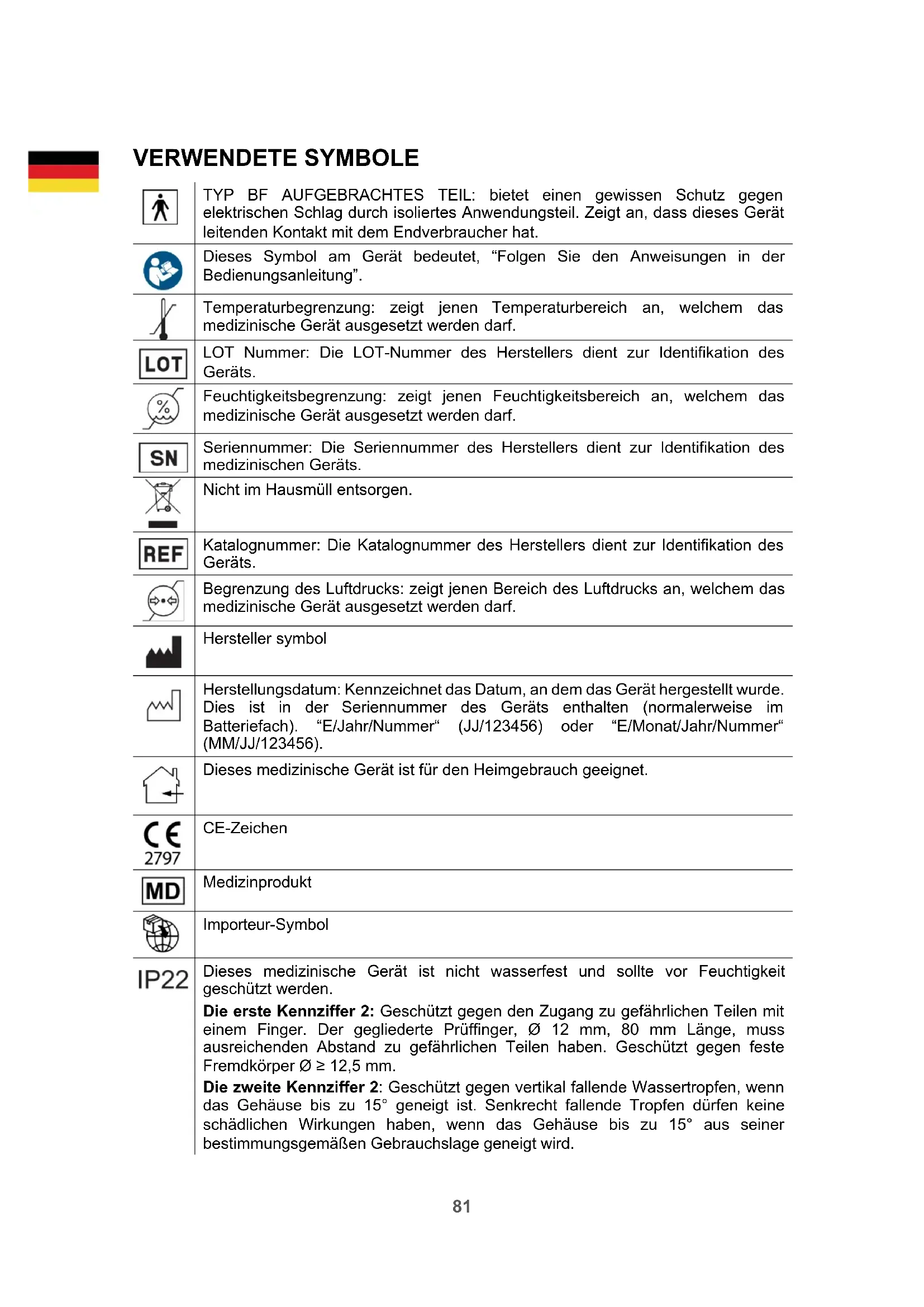 Lagerung: Temperaturbereich: 5⁰C bis 40⁰C Luftfeuchtigkeit: 15 bis 93% RH nicht-kondensierend Luftdruck: 700hPa bis 1060hPa Temperaturbereich: -25⁰C bis +70⁰C Luftfeuchtigkeit: Bis zu 93% RH nicht-kondensierend TYP BF AUFGEBRACHTES TEIL Das Gerät bietet einen gewissen Schutzgrad gegen Stromschlag durch isolierten Anwendungsteil. Dieses Symbol auf dem Gerät bedeutet, „Bedienungsanleitung beachten”. IP22 Das Gerät ist nicht wasserdicht und sollte gegen Eindringen von Feuchtigkeit und Flüssigkeiten geschützt werden. Stimmt mit EU WEEE Regulierungen überein. Hinweis: Die elektrischen Spezifikationen sind Nennwerte und Abweichungen von mindestens 5% von den angeführten Werten, aufgrund normaler Abweichungen bei der Herstellung, sind vorbehalten. Hinweis: Es dauert mindestens 30 Minuten, bis sich das Gerät von der minimalen / maximalen Lagertemperatur zwischen den Einsätzen erwärmt / abgekühlt hat, bis es für den beabsichtigten Gebrauch bereit ist.105
