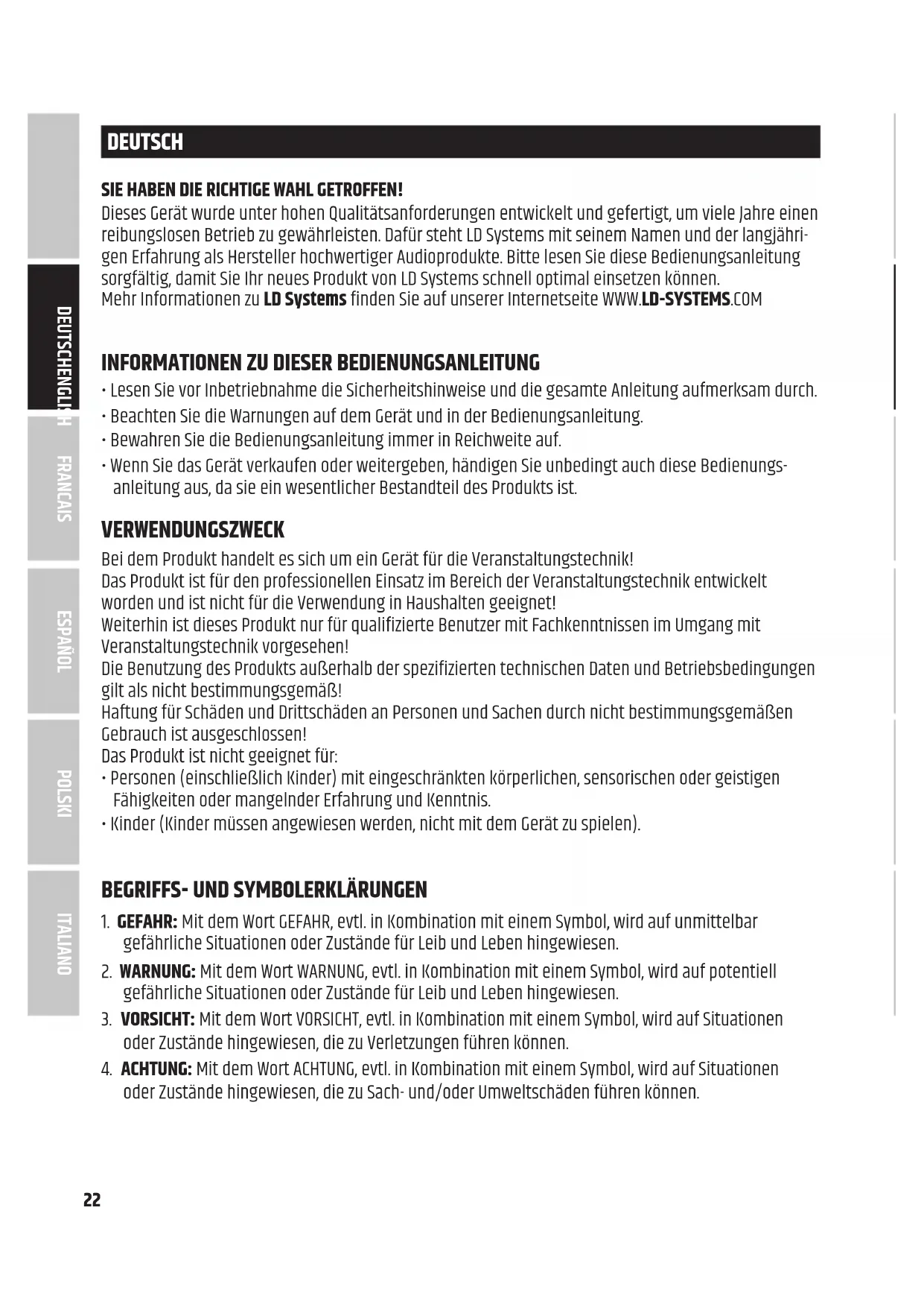 BEDIENUNGSANLEITUNG 22 VERWENDUNGSZWECK 22