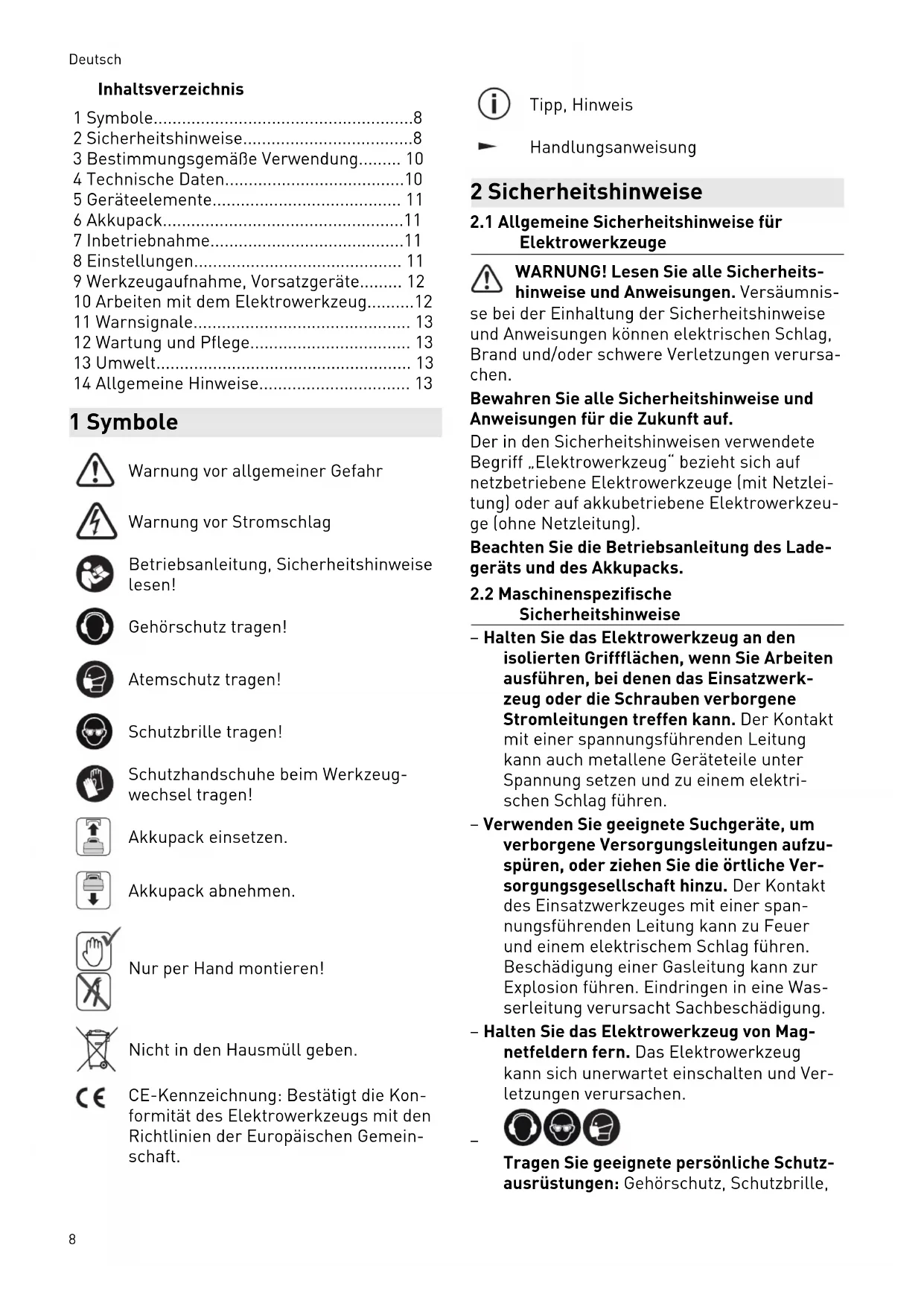 - 14 Allgemeine Hinweise 1 Symbole Warnung vor allgemeiner Gefahr Warnung vor Stromschlag Betriebsanleitung, Sicherheitshinweise lesen! Gehörschutz tragen! Atemschutz tragen! Schutzbrille tragen! Schutzhandschuhe beim Werkzeug wechsel tragen! Akkupack einsetzen. Akkupack abnehmen. Nur per Hand montieren! Nicht in den Hausmüll geben. CE-Kennzeichnung: Bestätigt die Kon formität des Elektrowerkzeugs mit den Richtlinien der Europäischen Gemein schaft. Tipp, Hinweis Handlungsanweisung 2 Sicherheitshinweise p. 13