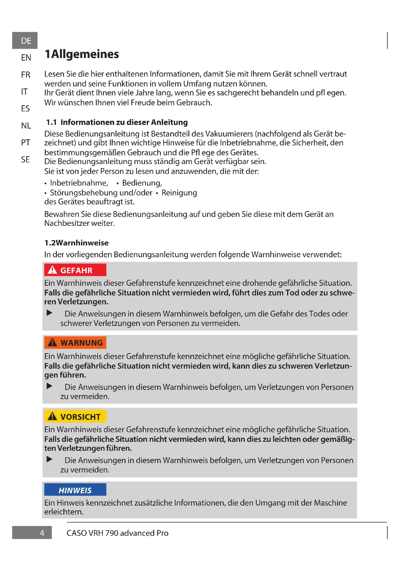 In der vorliegenden Bedienungsanleitung werden folgende Warnhinweise verwendet: Ein Warnhinweis dieser Gefahrenstufe kennzeichnet eine drohende gefährliche Situation. Falls die gefährliche Situation nicht vermieden wird, führt dies zum Tod oder zu schwe- ren Verletzungen. Die Anweisungen in diesem Warnhinweis befolgen, um die Gefahr des Todes oder schwerer Verletzungen von Personen zu vermeiden. Ein Warnhinweis dieser Gefahrenstufe kennzeichnet eine mögliche gefährliche Situation. Falls die gefährliche Situation nicht vermieden wird, kann dies zu schweren Verletzun- gen führen. Die Anweisungen in diesem Warnhinweis befolgen, um Verletzungen von Personen zu vermeiden. Ein Warnhinweis dieser Gefahrenstufe kennzeichnet eine mögliche gefährliche Situation. Falls die gefährliche Situation nicht vermieden wird, kann dies zu leichten oder gemäßig- ten Verletzungen führen. Die Anweisungen in diesem Warnhinweis befolgen, um Verletzungen von Personen zu vermeiden. Ein Hinweis kennzeichnet zusätzliche Informationen, die den Umgang mit der Maschine erleichtern. GEFAHR WARNUNG VORSICHT HINWEIS5 CASO VRH 790 advanced Pro