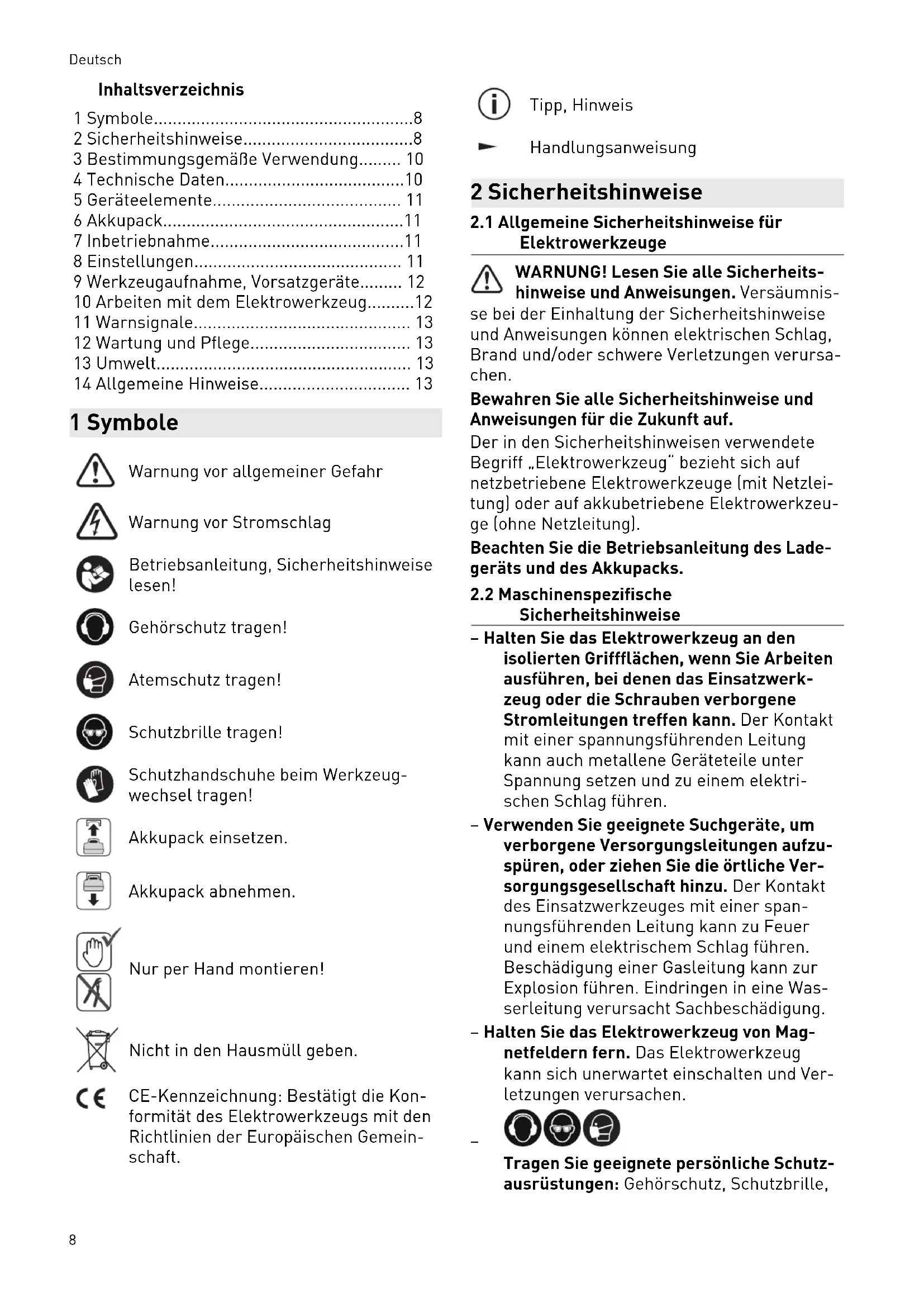 - 14 Allgemeine Hinweise 1 Symbole Warnung vor allgemeiner Gefahr Warnung vor Stromschlag Betriebsanleitung, Sicherheitshinweise lesen! Gehörschutz tragen! Atemschutz tragen! Schutzbrille tragen! Schutzhandschuhe beim Werkzeug wechsel tragen! Akkupack einsetzen. Akkupack abnehmen. Nur per Hand montieren! Nicht in den Hausmüll geben. CE-Kennzeichnung: Bestätigt die Kon formität des Elektrowerkzeugs mit den Richtlinien der Europäischen Gemein schaft. Tipp, Hinweis Handlungsanweisung 2 Sicherheitshinweise p. 13