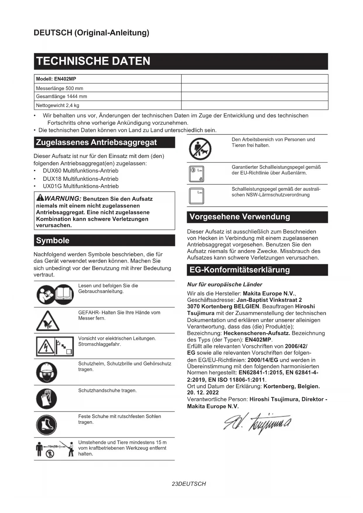- UX01GMultifunktions-Antrieb WARNUNG: Benutzen Sie den Aufsatz niemals mit einem nicht zugelassenen Antriebsaggregat. Eine nicht zugelassene Kombination kann schwere Verletzungen verursachen. Symbole NachfolgendwerdenSymbolebeschrieben,diefür das Gerät verwendet werden können. Machen Sie sichunbedingtvorderBenutzungmitihrerBedeutung vertraut. LesenundbefolgenSiedie Gebrauchsanleitung. GEFAHR- Halten Sie Ihre Hände vom Messer fern. Vorsicht vor elektrischen Leitungen. Stromschlaggefahr. Schutzhelm,SchutzbrilleundGehörschutz tragen. Schutzhandschuhe tragen. Feste Schuhe mit rutschfesten Sohlen tragen. Umstehende und Tiere mindestens 15 m vomkraftbetriebenenWerkzeugentfernt halten. DenArbeitsbereichvonPersonenund Tieren frei halten. Garantierter Schallleistungspegel gemäß derEU-RichtlinieüberAußenlärm. Schallleistungspegel gemäß der australi- schen NSW-Lärmschutzverordnung Vorgesehene Verwendung Dieser Aufsatz ist ausschließlich zum Beschneiden vonHeckeninVerbindungmiteinemzugelassenen Antriebsaggregatvorgesehen.BenutzenSieden AufsatzniemalsfürandereZwecke.Missbrauchdes Aufsatzes kann schwere Verletzungen verursachen. EG-Konformitätserklärung Nur für europäische Länder Wir als die Hersteller: Makita Europe N.V., Geschäftsadresse: Jan-Baptist Vinkstraat 2 3070 Kortenberg BELGIEN. Beauftragen Hiroshi TsujimuramitderZusammenstellungdertechnischen Dokumentation und erklären unter unserer alleinigen Verantwortung,dassdas(die)Produkt(e); Bezeichnung: Heckenscheren-Aufsatz. Bezeichnung desTyps(derTypen):EN402MP. Erfüllt alle relevanten Vorschriften von 2006/42/ EG sowie alle relevanten Vorschriften der folgen- den EG/EU-Richtlinien: 2000/14/EG und werden in Übereinstimmungmitdenfolgendenharmonisierten Normen hergestellt: EN62841-1:2015, EN 62841-4- 2:2019, EN ISO 11806-1:2011. Ort und Datum der Erklärung: Kortenberg, Belgien.