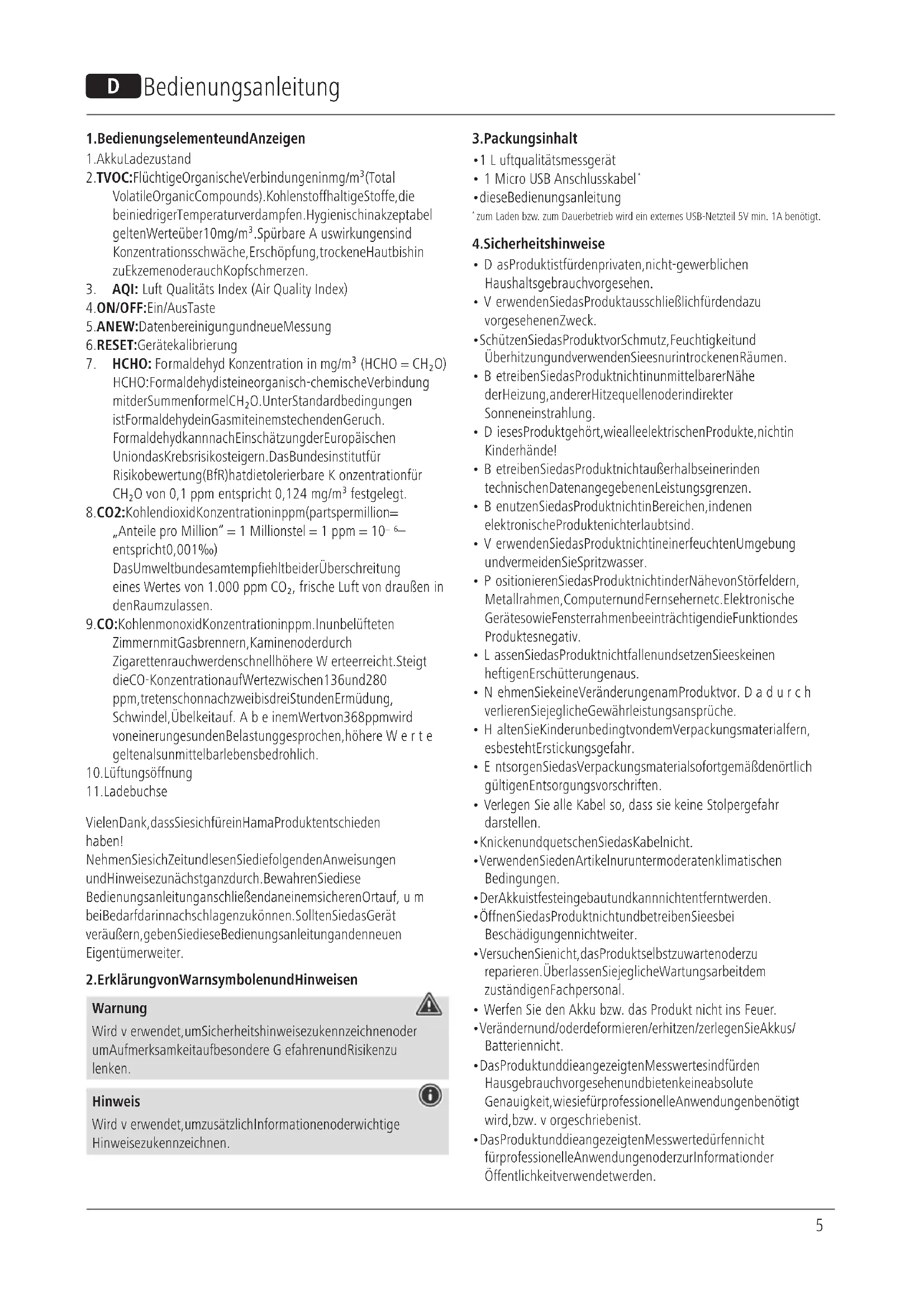 Das Messgerät darf nicht als Warnmelder für gefährlich hohe Konzentrationen (z.B. Arbeitsschutzüberwachungen) verwendet werden. Es ist nicht geeignet für medizinische Einrichtungen, Zertizierungen oder Testmessungen. Vornämlich dient das Messgerät zu Prüfzwecken und als Orientierung im privaten Hausgebrauch. Es wirdkeinerlei Haftung bei Fehlfunktion für mögliche Schäden übernommen. Es ist keine Datenübertragung über das USB Kabel möglich. Die Hama GmbH &CoKGübernimmt keinerlei Haftung oder Gewährleistung für Schäden, die aus unsachgemäßer Installation, Montage und unsachgemäßem Gebrauch des Produktes oder einer Nichtbeachtung der Bedienungsanleitung und/oder der Sicherheitshinweise resultieren.