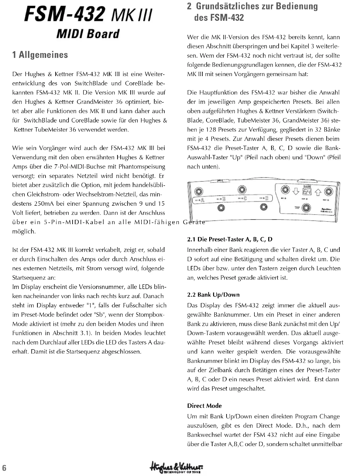 中文6 1 Allgemeines Der Hughes & Kettner FSM-432 MK III ist eine Weiter- entwicklung des von SwitchBlade und CoreBlade be- kannten FSM-432 MK II. Die Version MK III wurde auf den Hughes & Kettner GrandMeister 36 optimiert, bie- tet aber alle Funktionen des MK II und kann daher auch für SwitchBlade und CoreBlade sowie für den Hughes & Kettner TubeMeister 36 verwendet werden. Wie sein Vorgänger wird auch der FSM-432 MK III bei Verwendung mit den oben erwähnten Hughes & Kettner Amps über die 7-Pol-MIDI-Buchse mit Phantomspeisung versorgt; ein separates Netzteil wird nicht benötigt. Er bietet aber zusätzlich die Option, mit jedem handelsübli- chen Gleichstrom- oder Wechselstrom-Netzteil, das min- destens 250mA bei einer Spannung zwischen 9 und 15 Volt liefert, betrieben zu werden. Dann ist der Anschluss über ein 5-Pin-MIDI-Kabel an alle MIDI-fähigen Geräte möglich. Ist der FSM-432 MK III korrekt verkabelt, zeigt er, sobald er durch Einschalten des Amps oder durch Anschluss ei- nes externen Netzteils, mit Strom versogt wird, folgende Startsequenz an: Im Display erscheint die Versionsnummer, alle LEDs blin- ken nacheinander von links nach rechts kurz auf. Danach steht im Display entweder "1", falls der Fußschalter sich im Preset-Mode befindet oder "Sb", wenn der Stompbox- Mode aktiviert ist (mehr zu den beiden Modes und ihren Funktionen in Abschnitt 3.1). In beiden Modes leuchtet nach dem Durchlauf aller LEDs die LED des Tasters A dau- erhaft. Damit ist die Startsequenz abgeschlossen. 2 Grundsätzliches zur Bedienung des FSM-432 Wer die MK II-Version des FSM-432 bereits kennt, kann diesen Abschnitt überspringen und bei Kapitel 3 weiterle- sen. Wem der FSM-432 noch nicht vertraut ist, der sollte folgende Bedienungsgrundlagen kennen, die der FSM-432 MK III mit seinen Vorgängern gemeinsam hat: Die Hauptfunktion des FSM-432 war bisher die Anwahl der im jeweiligen Amp gespeicherten Presets. Bei allen oben aufgeführten Hughes & Kettner Verstärkern (Switch- Blade, CoreBlade, TubeMeister 36, GrandMeister 36) ste- hen je 128 Presets zur Verfügung, gegliedert in 32 Bänke mit je 4 Presets. Zur Anwahl dieser Presets dienen beim FSM-432 die Preset-Taster A, B, C, D sowie die Bank- Auswahl-Taster "Up" (Pfeil nach oben) und "Down" (Pfeil nach unten).