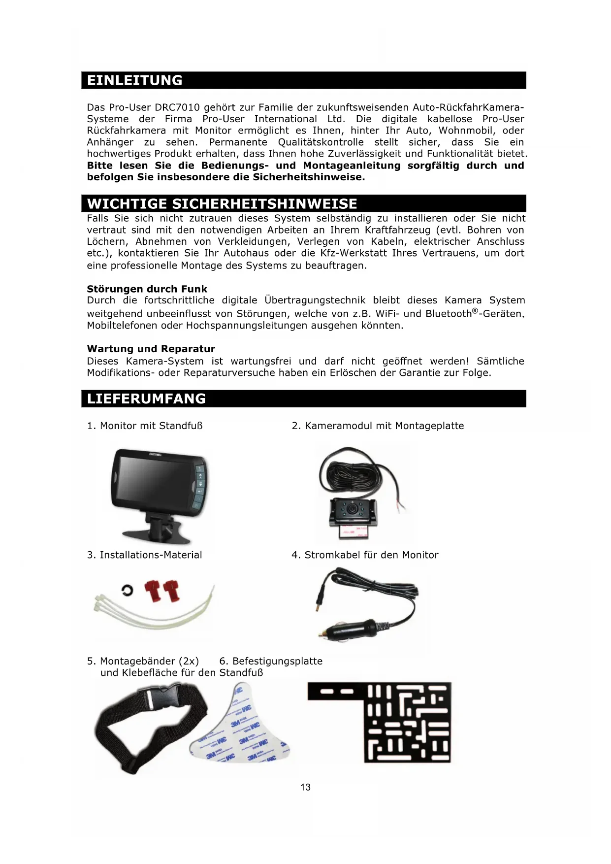 Das Pro-User DRC7010 gehört zur Familie der zukunftsweisenden Auto-RückfahrKamera- Systeme der Firma Pro-User International Ltd. Die digitale kabellose Pro-User Rückfahrkamera mit Monitor ermöglicht es Ihnen, hinter Ihr Auto, Wohnmobil, oder Anhänger zu sehen. Permanente Qualitätskontrolle stellt sicher, dass Sie ein hochwertiges Produkt erhalten, dass Ihnen hohe Zuverlässigkeit und Funktionalität bietet. Bitte lesen Sie die Bedienungs- und Montageanleitung sorgfältig durch und befolgen Sie insbesondere die Sicherheitshinweise. WICHTIGE SICHERHEITSHINWEISE Falls Sie sich nicht zutrauen dieses System selbständig zu installieren oder Sie nicht vertraut sind mit den notwendigen Arbeiten an Ihrem Kraftfahrzeug (evtl. Bohren von Löchern, Abnehmen von Verkleidungen, Verlegen von Kabeln, elektrischer Anschluss etc.), kontaktieren Sie Ihr Autohaus oder die Kfz-Werkstatt Ihres Vertrauens, um dort eine professionelle Montage des Systems zu beauftragen. Störungen durch Funk Durch die fortschrittliche digitale Übertragungstechnik bleibt dieses Kamera System weitgehend unbeeinflusst von Störungen, welche von z.B. WiFi- und Bluetooth