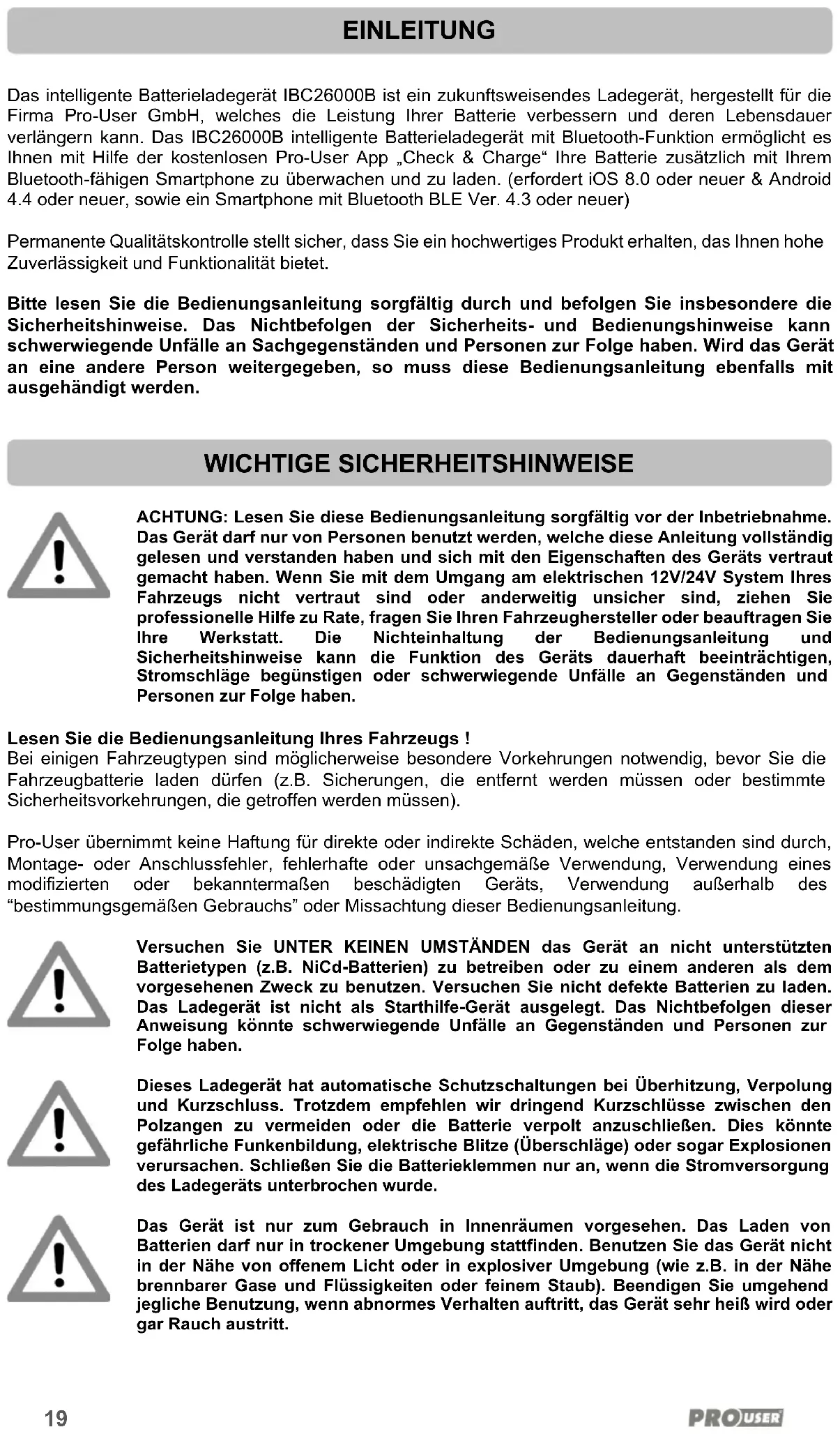 ACHTUNG: Lesen Sie diese Bedienungsanleitung sorgfältig vor der Inbetriebnahme. Das Gerät darf nur von Personen benutzt werden, welche diese Anleitung vollständig gelesen und verstanden haben und sich mit den Eigenschaften des Geräts vertraut gemacht haben. Wenn Sie mit dem Umgang am elektrischen 12V/24V System Ihres Fahrzeugs nicht vertraut sind oder anderweitig unsicher sind, ziehen Sie professionelle Hilfe zu Rate, fragen Sie Ihren Fahrzeughersteller oder beauftragen Sie Ihre Werkstatt. Die Nichteinhaltung der Bedienungsanleitung und Sicherheitshinweise kann die Funktion des Geräts dauerhaft beeinträchtigen, Stromschläge begünstigen oder schwerwiegende Unfälle an Gegenständen und Personen zur Folge haben. Lesen Sie die Bedienungsanleitung Ihres Fahrzeugs ! Bei einigen Fahrzeugtypen sind möglicherweise besondere Vorkehrungen notwendig, bevor Sie die Fahrzeugbatterie laden dürfen (z.B. Sicherungen, die entfernt werden müssen oder bestimmte Sicherheitsvorkehrungen, die getroffen werden müssen). Pro-User übernimmt keine Haftung für direkte oder indirekte Schäden, welche entstanden sind durch, Montage- oder Anschlussfehler, fehlerhafte oder unsachgemäße Verwendung, Verwendung eines modifizierten oder bekanntermaßen beschädigten Geräts, Verwendung außerhalb des “bestimmungsgemäßen Gebrauchs” oder Missachtung dieser Bedienungsanleitung. Versuchen Sie UNTER KEINEN UMSTÄNDEN das Gerät an nicht unterstützten Batterietypen (z.B. NiCd-Batterien) zu betreiben oder zu einem anderen als dem vorgesehenen Zweck zu benutzen. Versuchen Sie nicht defekte Batterien zu laden. Das Ladegerät ist nicht als Starthilfe-Gerät ausgelegt. Das Nichtbefolgen dieser Anweisung könnte schwerwiegende Unfälle an Gegenständen und Personen zur Folge haben. Dieses Ladegerät hat automatische Schutzschaltungen bei Überhitzung, Verpolung und Kurzschluss. Trotzdem empfehlen wir dringend Kurzschlüsse zwischen den Polzangen zu vermeiden oder die Batterie verpolt anzuschließen. Dies könnte gefährliche Funkenbildung, elektrische Blitze (Überschläge) oder sogar Explosionen verursachen. Schließen Sie die Batterieklemmen nur an, wenn die Stromversorgung des Ladegeräts unterbrochen wurde. Das Gerät ist nur zum Gebrauch in Innenräumen vorgesehen. Das Laden von Batterien darf nur in trockener Umgebung stattfinden. Benutzen Sie das Gerät nicht in der Nähe von offenem Licht oder in explosiver Umgebung (wie z.B. in der Nähe brennbarer Gase und Flüssigkeiten oder feinem Staub). Beendigen Sie umgehend jegliche Benutzung, wenn abnormes Verhalten auftritt, das Gerät sehr heiß wird oder gar Rauch austritt. EINLEITUNG WICHTIGE SICHERHEITSHINWEISE20