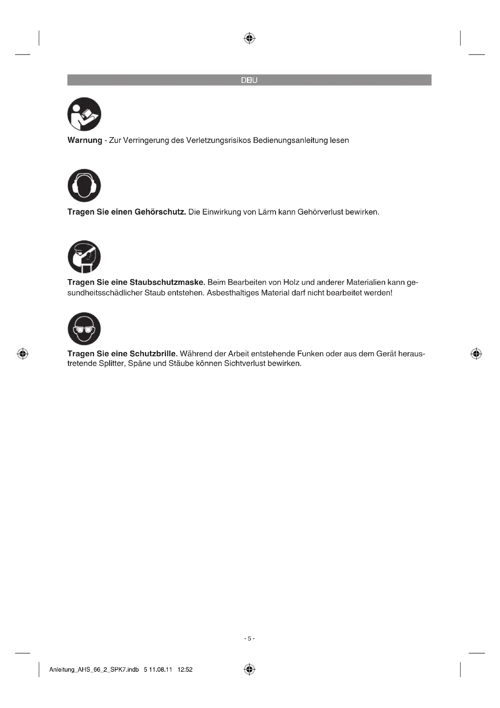 Warnung - Zur Verringerung des Verletzungsrisikos Bedienungsanleitung lesen Tragen Sie einen Gehörschutz. Die Einwirkung von Lärm kann Gehörverlust bewirken. Tragen Sie eine Schutzbrille. Während der Arbeit entstehende Funken oder aus dem Gerät heraus- tretende Splitter, Späne und Stäube können Sichtverlust bewirken. Tragen Sie eine Staubschutzmaske. Beim Bearbeiten von Holz und anderer Materialien kann ge- sundheitsschädlicher Staub entstehen. Asbesthaltiges Material darf nicht bearbeitet werden! Anleitung_AHS_66_2_SPK7.indb 5 11.08.11 12:52DDEU
