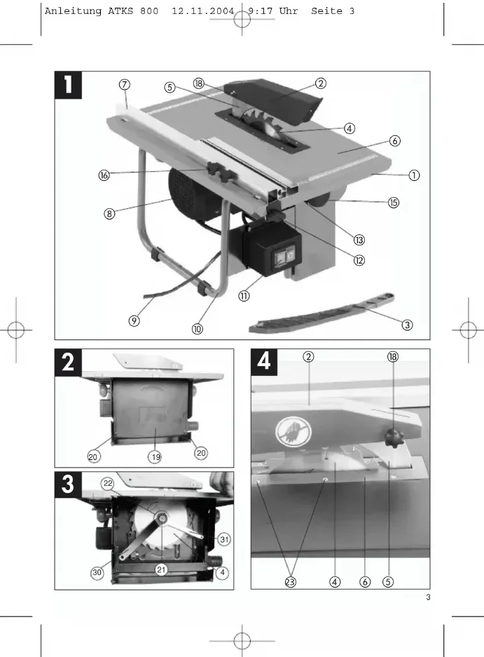 1 Sägetisch 2 Sägeblattschutz 3 Schiebestock 4 Sägeblatt 5 Spaltkeil 6 Tischeinlage 7 Parallelanschlag 8 Motor 9 Netzleitung 10 Gestell 11 Ein-, Ausschalter 12 Sterngriffschraube für Parallelanschlag 13 Skala für Winkeleinstellung 15 Sterngriffschraube 16 Sterngriffschraube für Anschlagschiene 17 Sterngriffschraube für Begrenzung 18 Sterngriffschraube für Sägeblattschutz
