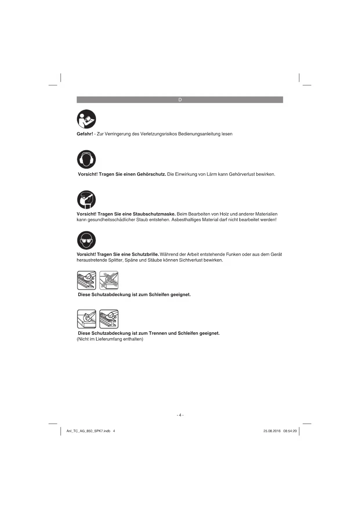 Gefahr! - Zur Verringerung des Verletzungsrisikos Bedienungsanleitung lesen Vorsicht! Tragen Sie einen Gehörschutz. Die Einwirkung von Lärm kann Gehörverlust bewirken. Vorsicht! Tragen Sie eine Schutzbrille. Während der Arbeit entstehende Funken oder aus dem Gerät heraustretende Splitter, Späne und Stäube können Sichtverlust bewirken. Vorsicht! Tragen Sie eine Staubschutzmaske. Beim Bearbeiten von Holz und anderer Materialien kann gesundheitsschädlicher Staub entstehen. Asbesthaltiges Material darf nicht bearbeitet werden! Diese Schutzabdeckung ist zum Trennen und Schleifen geeignet. (Nicht im Lieferumfang enthalten) Diese Schutzabdeckung ist zum Schleifen geeignet. Anl_TC_AG_850_SPK7.indb 4Anl_TC_AG_850_SPK7.indb 4 25.08.2016 08:54:2025.08.2016 08:54:20D