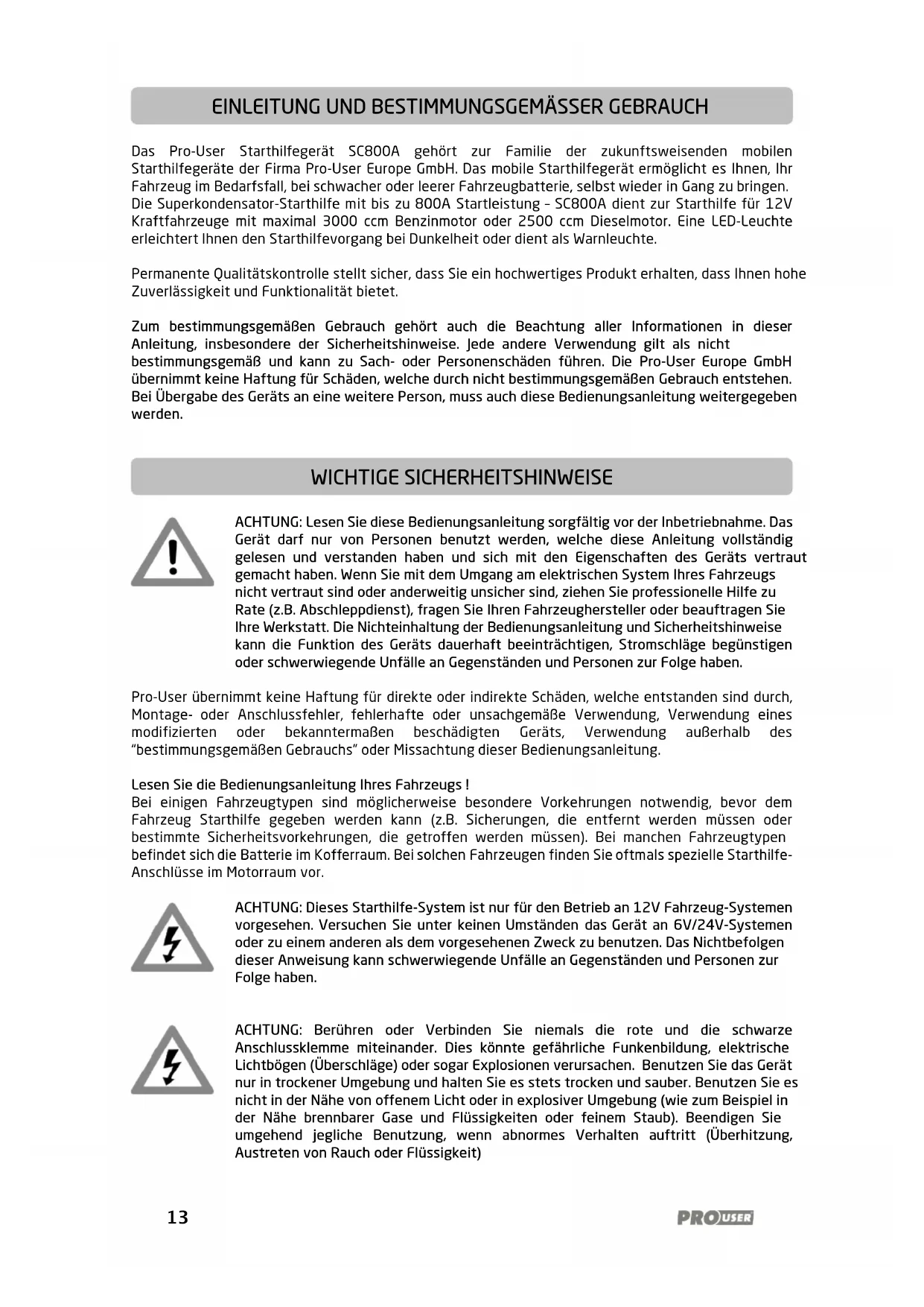 Das Pro-User Starthilfegerät SC800A gehört zur Familie der zukunftsweisenden mobilen Starthilfegeräte der Firma Pro-User Europe GmbH. Das mobile Starthilfegerät ermöglicht es Ihnen, Ihr Fahrzeug im Bedarfsfall, bei schwacher oder leerer Fahrzeugbatterie, selbst wieder in Gang zu bringen. Die Superkondensator-Starthilfe mit bis zu 800A Startleistung – SC800A dient zur Starthilfe für 12V Kraftfahrzeuge mit maximal 3000 ccm Benzinmotor oder 2500 ccm Dieselmotor. Eine LED-Leuchte erleichtert Ihnen den Starthilfevorgang bei Dunkelheit oder dient als Warnleuchte. Permanente Qualitätskontrolle stellt sicher, dass Sie ein hochwertiges Produkt erhalten, dass Ihnen hohe Zuverlässigkeit und Funktionalität bietet. Zum bestimmungsgemäßen Gebrauch gehört auch die Beachtung aller Informationen in dieser Anleitung, insbesondere der Sicherheitshinweise. Jede andere Verwendung gilt als nicht bestimmungsgemäß und kann zu Sach- oder Personenschäden führen. Die Pro-User Europe GmbH übernimmt keine Haftung für Schäden, welche durch nicht bestimmungsgemäßen Gebrauch entstehen. Bei Übergabe des Geräts an eine weitere Person, muss auch diese Bedienungsanleitung weitergegeben werden.