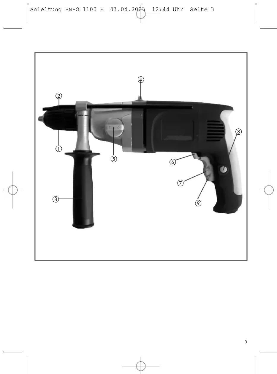 VERWENDUNG Die Bohrmaschine ist zum Bohren von Löchern in Holz, Eisen, Buntmetallen und Gestein unter Ver- wendung des entsprechenden Bohrwerkzeugs ausgelegt. Beschreibung 1 Schnellspannbohrfutter 2 Bohrtiefenanschlag 3 Zusatzgriff 4 Bohren/Schlagbohren-Umschalter 5 Umschalter 1. Gang / 2. Gang 6 Rechts-/Linkslauf-Umschalter 7 Drehzahl-Regler 8 Feststellknopf 9 Betriebsschalter Technische Daten Netzspannung 230 V ~ 50 Hz Aufnahmeleistung 1100 W Bohrleistung Beton 16 mm. Stahl 13 mm Holz 32 mm Leerlaufdrehzahl 1. Gang 0 - 1100 min