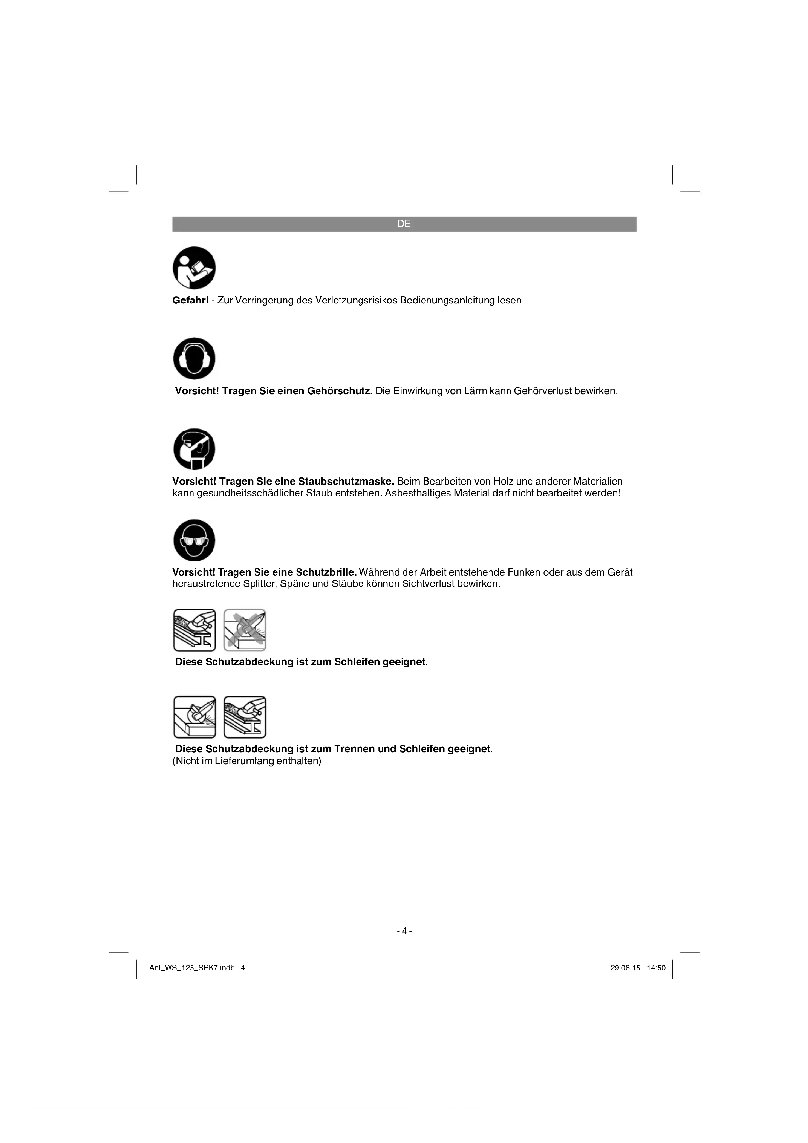 Gefahr! - Zur Verringerung des Verletzungsrisikos Bedienungsanleitung lesen Vorsicht! Tragen Sie einen Gehörschutz. Die Einwirkung von Lärm kann Gehörverlust bewirken. Vorsicht! Tragen Sie eine Schutzbrille. Während der Arbeit entstehende Funken oder aus dem Gerät heraustretende Splitter, Späne und Stäube können Sichtverlust bewirken. Vorsicht! Tragen Sie eine Staubschutzmaske. Beim Bearbeiten von Holz und anderer Materialien kann gesundheitsschädlicher Staub entstehen. Asbesthaltiges Material darf nicht bearbeitet werden! Diese Schutzabdeckung ist zum Trennen und Schleifen geeignet. (Nicht im Lieferumfang enthalten) Diese Schutzabdeckung ist zum Schleifen geeignet. Anl_WS_125_SPK7.indb 4Anl_WS_125_SPK7.indb 4 29.06.15 14:5029.06.15 14:50DE