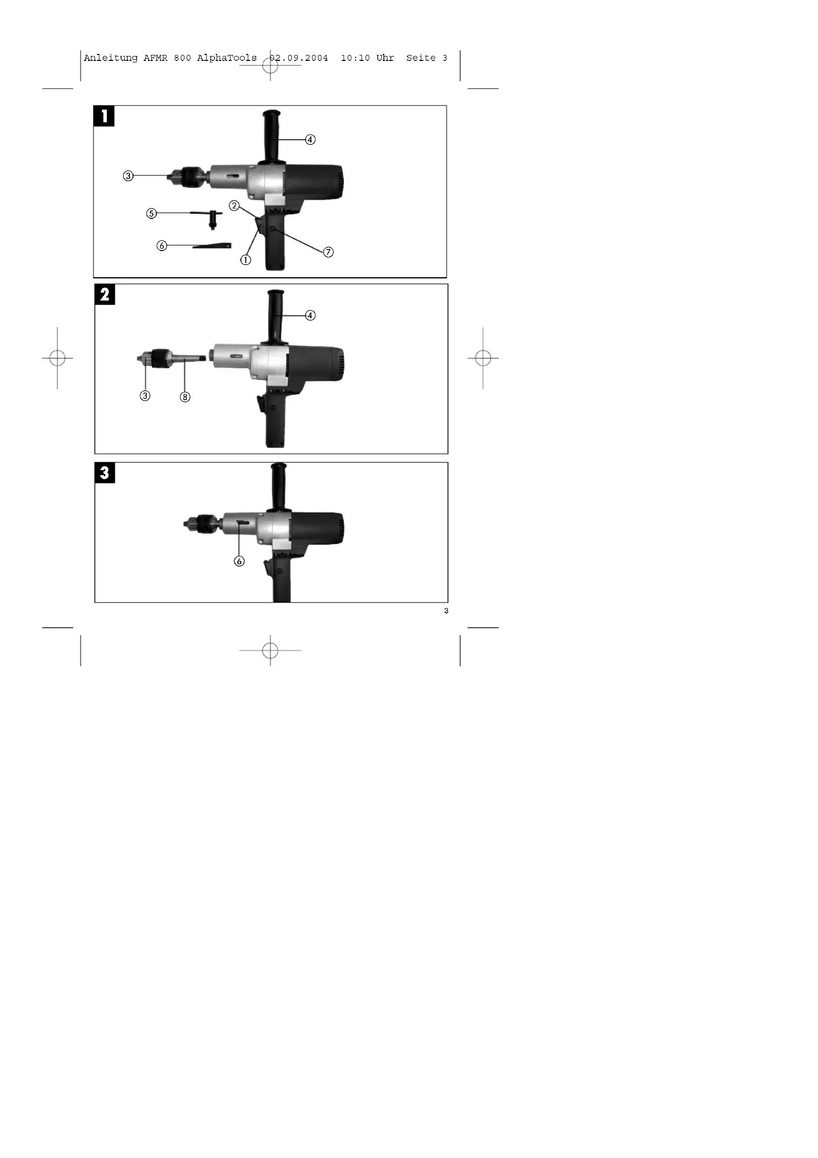 Schutzisoliert II / Gewicht 4,6 kg Wichtige Hinweise Bitte lesen Sie die Gebrauchsanweisung sorgfältig durch und beachten Sie deren Hinweise. Machen Sie sich anhand dieser Gebrauchsanweisung mit dem Gerät, dem richtigen Gebrauch sowie den Sicher- heitshinweisen vertraut. Sicherheitshinweise Achtung! Beim Gebrauch von Elektrowerkzeugen sind zum Schutz gegen elektrischen Schlag, Ver- letzungs- und Brandgefahr folgende grundsätzlichen Sicherheitsmaßnahmen zu beachten. Lesen und be- achten Sie diese Hinweise, bevor Sie das Werkzeug benutzen.Diese Hinweise müssen sicher aufbewahrt werden. Weitere Sicherheitshinweise finden Sie in dem beiliegenden Heftchen. ● Das Gerät nicht in einer Umgebung mit explo- sionsgefährlicher Atmosphäre betreiben. Keine Lösungsmittel oder lösungsmittelhaltigen Stoffe mit einem Flammpunkt unter 21°C mischen. ● Legen Sie keine Kabel um irgendwelche Körper- teile. ● Nur ein für den Arbeitsbereich zugelassenes Ver- längerungskabel verwenden. ● Das Gerät nur im Mischgefäß an-/ auslaufen lassen. Für festen und sicheren Stand des Misch- gefäßes sorgen. ● Bei laufenden Mischarbeiten nicht mit den Händen, oder Gegenständen in das Mischgefäß greifen. ● Bei der Arbeit mit der Rührmaschine ist das Tragen von Arbeitshandschuhen und einer Schutzbrille empfohlen. ● Das Tragen von enganliegender Kleidung ist Vor- schrift ● Benutzen Sie immer den Zusatzhandgriff ● Rechnen Sie mit Reaktionsdrehmoment Vor Inbetriebnahme (Abb. 2) Überzeugen Sie sich vor dem Anschließen, dass die Daten auf dem Typenschild mit den Netzdaten über- einstimmen. Montieren Sie den Zusatzhandgriff (4) am Gerät Vor der Montage des Bohrfutters (3) mit dem MK- Schaft (8), beide Teile auf Sauberkeit überprüfen. Anschließend MK-Schaft (8) mit kräftigen Ruck in den Konus des Bohrfutters einschieben. Danach den Konus ebenso in die Bohrspindel einschieben. Inbetriebnahme Ein-/ Auschalter Durch mehr oder weniger starkes Drücken des Schalters (1) wählen Sie die Drehzahl. Einschalten: Schalter (1) drücken Dauerbetrieb: Schalter (1) mit Feststellknopf (7) sichern Ausschalten: Schalter (1) kurz eindrücken Anleitung AFMR 800 AlphaTools 02.09.2004 10:10 Uhr Seite 4Mit dem Umschalter (2) können Sie die Drehrichtung wählen. Arbeiten mit dem Farb- und Mörtel- rührer Zusatzhandgriff muß montiert sein! Beim Rührerwechsel muß der Netzstecker gezogen werden. Beim Eintauchen in das Mischgut, bzw. Heraus- nehmen aus dem Mischgut mit reduzierter Drehzahl arbeiten. Nach dem vollständigen Eintauchen Dreh- zahl bis zum Maximum steigern, damit ist eine aus- reichende Motorkühlung gewährleistet. Während des Mischvorgangs die Maschine durch das Mischgefäß führen. So lange mischen bis das ganze Mischgut vollständig durchgearbeitet ist. Nach Beendigung der Mischarbeiten den Rührer reinigen. Entfernen des MK-Schaftes (Abb. 3) ● Drehen Sie die Bohrspindel, bis sie den MK-Schaft durch die seitliche Öffnung sehen ● Stecken Sie nun den Austreibkeil (6) in die seit- liche Öffnung ● Schlagen Sie mit einem Hammer auf den Aus- treibkeil (6), bis sich der MK-Schaft löst. Wartung ● Staub und Verschmutzung sind regelmäßig von der Maschine zu entfernen. Die Reinigung ist am besten mit einer feinen Bürste oder einem Lappen durchzuführen. ● Benutzen Sie zur Reinigung des Kunststoffes keine ätzenden Mittel. ● Die Lüftungsschilitze sauberhalten um eine ausreichende Kühlung zu gewährleisten Ersatzteilbestellung Bei der Ersatzteilbestellung sollten folgende An- gaben gemacht werden; Typ des Gerätes Artikelnummer des Gerätes Ident-Nummer des Gerätes Ersatzteilnummer des erforderlichen Ersatzteils Ersatzteil Ersatzteil-Nr. Schalter 42.583.50.01 Ersatzkohlen 42.583.50.02 Bohrfutter 42.583.50.03
