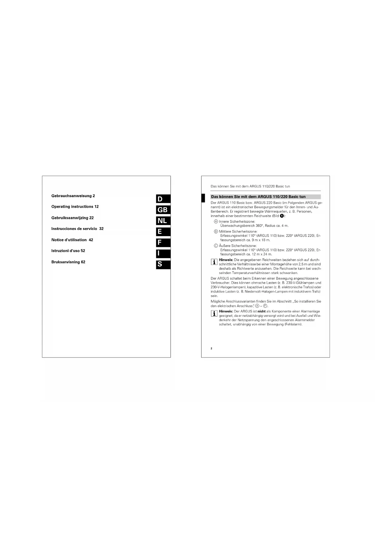 Das können Sie mit dem ARGUS 110/220 Basic tun Der ARGUS 110 Basic bzw. ARGUS 220 Basic (im Folgenden ARGUS ge- nannt) ist ein elektronischer Bewegungsmelder für den Innen- und Au- ßenbereich. Er registriert bewegte Wärmequellen, z. B. Personen, innerhalb einer bestimmten Reichweite (Bild !): A Innere Sicherheitszone: Überwachungsbereich 360°, Radius ca. 4 m. B Mittlere Sicherheitszone: Erfassungswinkel 110° (ARGUS 110) bzw. 220° (ARGUS 220), Er- fassungsbereich ca. 9 m x 18 m. C Äußere Sicherheitszone: Erfassungswinkel 110° (ARGUS 110) bzw. 220° (ARGUS 220), Er- fassungsbereich ca. 12 m x 24 m.