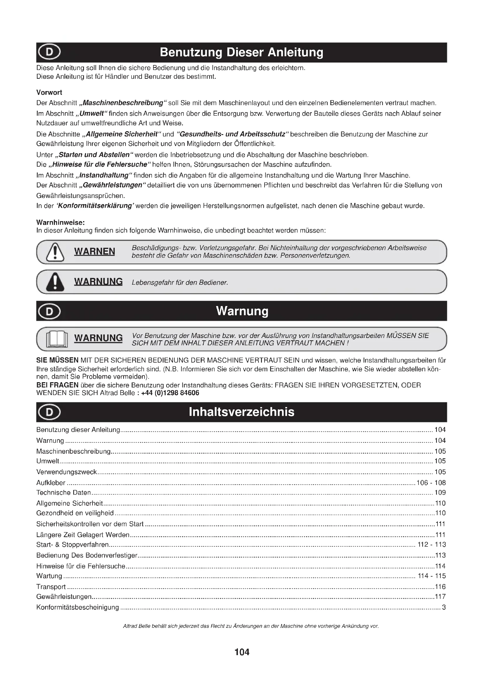 - BRUG SILICONE104 Inhaltsverzeichnis Benutzung Dieser Anleitung Diese Anleitung soll Ihnen die sichere Bedienung und die Instandhaltung des erleichtern. Diese Anleitung ist für Händler und Benutzer des bestimmt. Vorwort Der Abschnitt „Maschinenbeschreibung“ soll Sie mit dem Maschinenlayout und den einzelnen Bedienelementen vertraut machen. Im Abschnitt „Umwelt“ ¿ nden sich Anweisungen über die Entsorgung bzw. Verwertung der Bauteile dieses Geräts nach Ablauf seiner Nutzdauer auf umweltfreundliche Art und Weise. Die Abschnitte „Allgemeine Sicherheit“ und “Gesundheits- und Arbeitsschutz“ beschreiben die Benutzung der Maschine zur Gewährleistung Ihrer eigenen Sicherheit und von Mitgliedern der Öffentlichkeit. Unter „Starten und Abstellen“ werden die Inbetriebsetzung und die Abschaltung der Maschine beschrieben. Die „Hinweise für die Fehlersuche“ helfen Ihnen, Störungsursachen der Maschine aufzu¿ nden. Im Abschnitt „Instandhaltung“ ¿ nden sich die Angaben für die allgemeine Instandhaltung und die Wartung Ihrer Maschine. Der Abschnitt „Gewährleistungen“ detailliert die von uns übernommenen PÀ ichten und beschreibt das Verfahren für die Stellung von Gewährleistungsansprüchen. In der ‘Konformitätserklärung’ werden die jeweiligen Herstellungsnormen aufgelistet, nach denen die Maschine gebaut wurde. Warnhinweise: In dieser Anleitung ¿ nden sich folgende Warnhinweise, die unbedingt beachtet werden müssen: Lebensgefahr für den Bediener. WARNUNG Beschädigungs- bzw. Verletzungsgefahr. Bei Nichteinhaltung der vorgeschriebenen Arbeitsweise besteht die Gefahr von Maschinenschäden bzw. Personenverletzungen. WARNEN Warnung SIE MÜSSEN MIT DER SICHEREN BEDIENUNG DER MASCHINE VERTRAUT SEIN und wissen, welche Instandhaltungsarbeiten für Ihre ständige Sicherheit erforderlich sind. (N.B. Informieren Sie sich vor dem Einschalten der Maschine, wie Sie wieder abstellen kön- nen, damit Sie Probleme vermeiden). BEI FRAGEN über die sichere Benutzung oder Instandhaltung dieses Geräts: FRAGEN SIE IHREN VORGESETZTEN, ODER WENDEN SIE SICH Altrad Belle : +44 (0)1298 84606 Vor Benutzung der Maschine bzw. vor der Ausführung von Instandhaltungsarbeiten MÜSSEN SIE SICH MIT DEM INHALT DIESER ANLEITUNG VERTRAUT MACHEN ! WARNUNG Benutzung dieser Anleitung p. 104