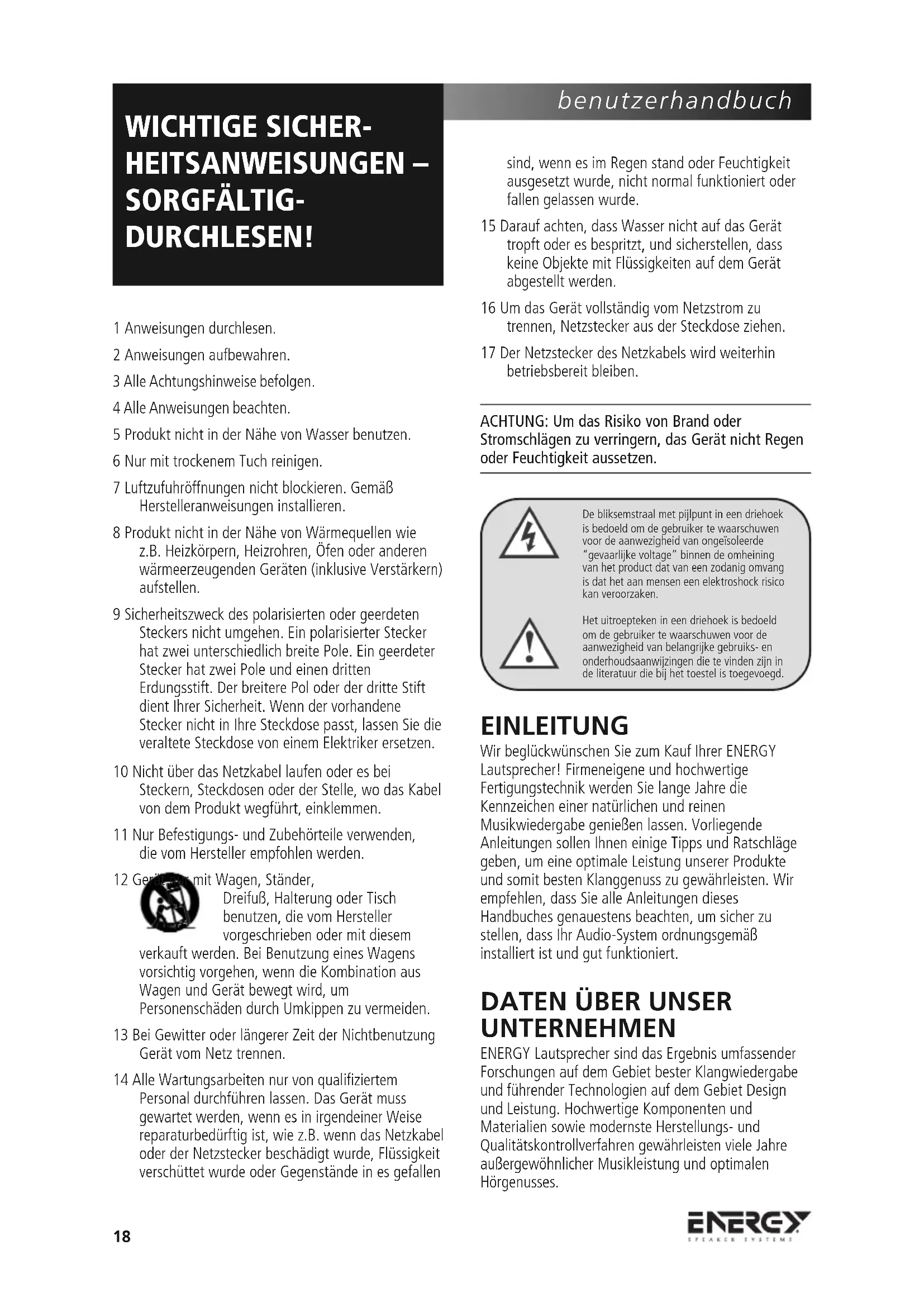 Consultare i dati relativi alla garanzia riportati a tergo. 17benutzerhandbuch 1 Anweisungen durchlesen. 2 Anweisungen aufbewahren. 3 Alle Achtungshinweise befolgen. 4 Alle Anweisungen beachten. 5 Produkt nicht in der Nähe von Wasser benutzen. 6 Nur mit trockenem Tuch reinigen. 7 Luftzufuhröffnungen nicht blockieren. Gemäß Herstelleranweisungen installieren. 8 Produkt nicht in der Nähe von Wärmequellen wie z.B. Heizkörpern, Heizrohren, Öfen oder anderen wärmeerzeugenden Geräten (inklusive Verstärkern) aufstellen. 9 Sicherheitszweck des polarisierten oder geerdeten Steckers nicht umgehen. Ein polarisierter Stecker hat zwei unterschiedlich breite Pole. Ein geerdeter Stecker hat zwei Pole und einen dritten Erdungsstift. Der breitere Pol oder der dritte Stift dient Ihrer Sicherheit. Wenn der vorhandene Stecker nicht in Ihre Steckdose passt, lassen Sie die veraltete Steckdose von einem Elektriker ersetzen. 10 Nicht über das Netzkabel laufen oder es bei Steckern, Steckdosen oder der Stelle, wo das Kabel von dem Produkt wegführt, einklemmen. 11 Nur Befestigungs- und Zubehörteile verwenden, die vom Hersteller empfohlen werden. 12 Gerät nur mit Wagen, Ständer, Dreifuß, Halterung oder Tisch benutzen, die vom Hersteller vorgeschrieben oder mit diesem verkauft werden. Bei Benutzung eines Wagens vorsichtig vorgehen, wenn die Kombination aus Wagen und Gerät bewegt wird, um Personenschäden durch Umkippen zu vermeiden. 13 Bei Gewitter oder längerer Zeit der Nichtbenutzung Gerät vom Netz trennen. 14 Alle Wartungsarbeiten nur von qualifiziertem Personal durchführen lassen. Das Gerät muss gewartet werden, wenn es in irgendeiner Weise reparaturbedürftig ist, wie z.B. wenn das Netzkabel oder der Netzstecker beschädigt wurde, Flüssigkeit verschüttet wurde oder Gegenstände in es gefallen sind, wenn es im Regen stand oder Feuchtigkeit ausgesetzt wurde, nicht normal funktioniert oder fallen gelassen wurde. 15 Darauf achten, dass Wasser nicht auf das Gerät tropft oder es bespritzt, und sicherstellen, dass keine Objekte mit Flüssigkeiten auf dem Gerät abgestellt werden. 16 Um das Gerät vollständig vom Netzstrom zu trennen, Netzstecker aus der Steckdose ziehen. 17 Der Netzstecker des Netzkabels wird weiterhin betriebsbereit bleiben. ACHTUNG: Um das Risiko von Brand oder Stromschlägen zu verringern, das Gerät nicht Regen oder Feuchtigkeit aussetzen. EINLEITUNG Wir beglückwünschen Sie zum Kauf Ihrer ENERGY Lautsprecher! Firmeneigene und hochwertige Fertigungstechnik werden Sie lange Jahre die Kennzeichen einer natürlichen und reinen Musikwiedergabe genießen lassen. Vorliegende Anleitungen sollen Ihnen einige Tipps und Ratschläge geben, um eine optimale Leistung unserer Produkte und somit besten Klanggenuss zu gewährleisten. Wir empfehlen, dass Sie alle Anleitungen dieses Handbuches genauestens beachten, um sicher zu stellen, dass Ihr Audio-System ordnungsgemäß installiert ist und gut funktioniert.