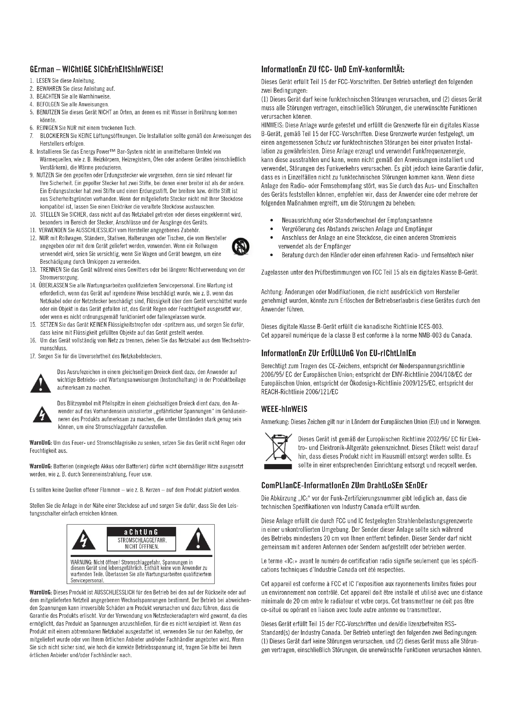 - BeratungdurchdenHändlerodereinenerfahrenenRadio-undFernsehtechniker Zugelassen unter den Prüfbestimmungen von FCC Teil 15 als ein digitales Klasse B-Gerät. Achtung: Änderungen oder Modifikationen, die nicht ausdrücklich vom Hersteller genehmigt wurden, könnte zum Erlöschen der Betriebserlaubnis diese Gerätes durch den Anwender führen. Dieses digitale Klasse B-Gerät erfüllt die kanadische Richtlinie ICES-003. Cet appareil numérique de la classe B est conforme à la norme NMB-003 du Canada. InformatIonEn ZUr ErfÜLLUnG Von EU-rIChtLInIEn Berechtigt zum Tragen des CE-Zeichens, entspricht der Niederspannungsrichtlinie 2006/95/ EC der Europäischen Union; entspricht der EMV-Richtlinie 2004/108/EC der Europäischen Union, entspricht der Ökodesign-Richtlinie 2009/125/EC, entspricht der REACH-Richtlinie 2006/121/EC WEEE-hInWEIS Anmerkung: Dieses Zeichen gilt nur in Ländern der Europäischen Union (EU) und in Norwegen. Dieses Gerät ist gemäß der Europäischen Richtlinie 2002/96/ EC für Elek- tro- und Elektronik-Altgeräte gekennzeichnet. Dieses Etikett weist darauf hin, dass dieses Produkt nicht im Hausmüll entsorgt werden sollte. Es sollte in einer entsprechenden Einrichtung entsorgt und recycelt werden. ComPLIanCE-InformatIonEn ZUm DrahtLoSEn SEnDEr Die Abkürzung „IC:“ vor der Funk-Zertifizierungsnummer gibt lediglich an, dass die technischen Spezifikationen von Industry Canada erfüllt wurden. Diese Anlage erfüllt die durch FCC und IC festgelegten Strahlenbelastungsgrenzwerte in einer unkontrollierten Umgebung. Der Sender dieser Anlage sollte sich während des Betriebs mindestens 20 cm von Ihnen entfernt befinden. Dieser Sender darf nicht gemeinsam mit anderen Antennen oder Sendern aufgestellt oder betrieben werden. Le terme «IC:» avant le numéro de certification radio signifie seulement que les spécifi- cations techniques d’Industrie Canada ont été respectées. Cet appareil est conforme à FCC et IC l’exposition aux rayonnements limites fixées pour un environnement non contrôlé. Cet appareil doit être installé et utilisé avec une distance minimale de 20 cm entre le radiateur et votre corps. Cet transmetteur ne doit pas être co-situé ou opérant en liaison avec toute autre antenne ou transmetteur. Dieses Gerät erfüllt Teil 15 der FCC-Vorschriften und den/die lizenzbefreiten RSS- Standard(s) der Industry Canada. Der Betrieb unterliegt den folgenden zwei Bedingungen: (1) Dieses Gerät darf keine Störungen verursachen, und (2) dieses Gerät muss alle Störun- gen vertragen, einschließlich Störungen, die unerwünschte Funktionen verursachen können. GErman – WIChtIGE SIChErhEItShInWEISE!