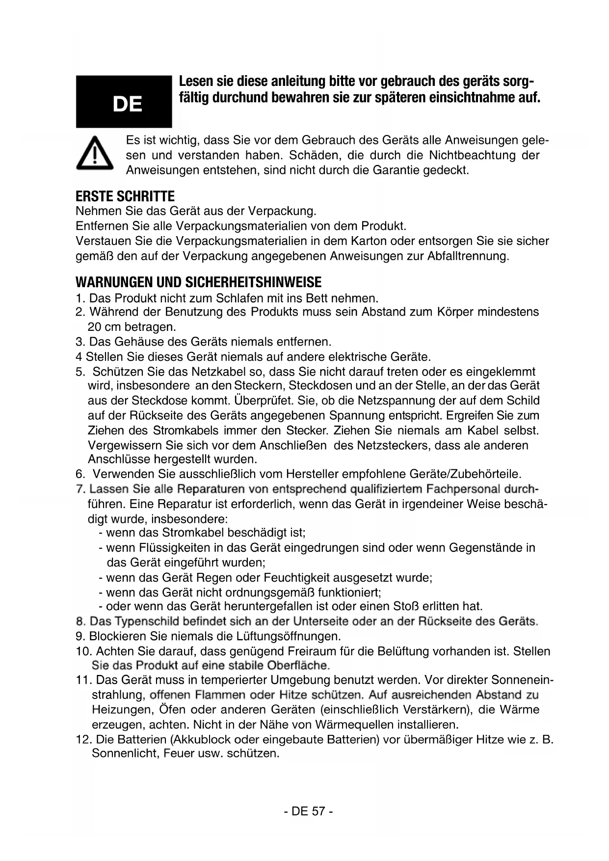 /(6(16,(',(6($1/(,781*%,77(925*(%5$8&+'(6*(576 625*)/7,*'85&+81'%(:$+5(16,(6,(=85637(5(1 (,16,&+71$+0($8)- DE 57 - Lesen sie diese anleitung bitte vor gebrauch des geräts sorg- fältig durchund bewahren sie zur späteren einsichtnahme auf. Es ist wichtig, dass Sie vor dem Gebrauch des Geräts alle Anweisungen gele- sen und verstanden haben. Schäden, die durch die Nichtbeachtung der Anweisungen entstehen, sind nicht durch die Garantie gedeckt. ERSTE SCHRITTE Nehmen Sie das Gerät aus der Verpackung. Entfernen Sie alle Verpackungsmaterialien von dem Produkt. Verstauen Sie die Verpackungsmaterialien in dem Karton oder entsorgen Sie sie sicher gemäß den auf der Verpackung angegebenen Anweisungen zur Abfalltrennung.